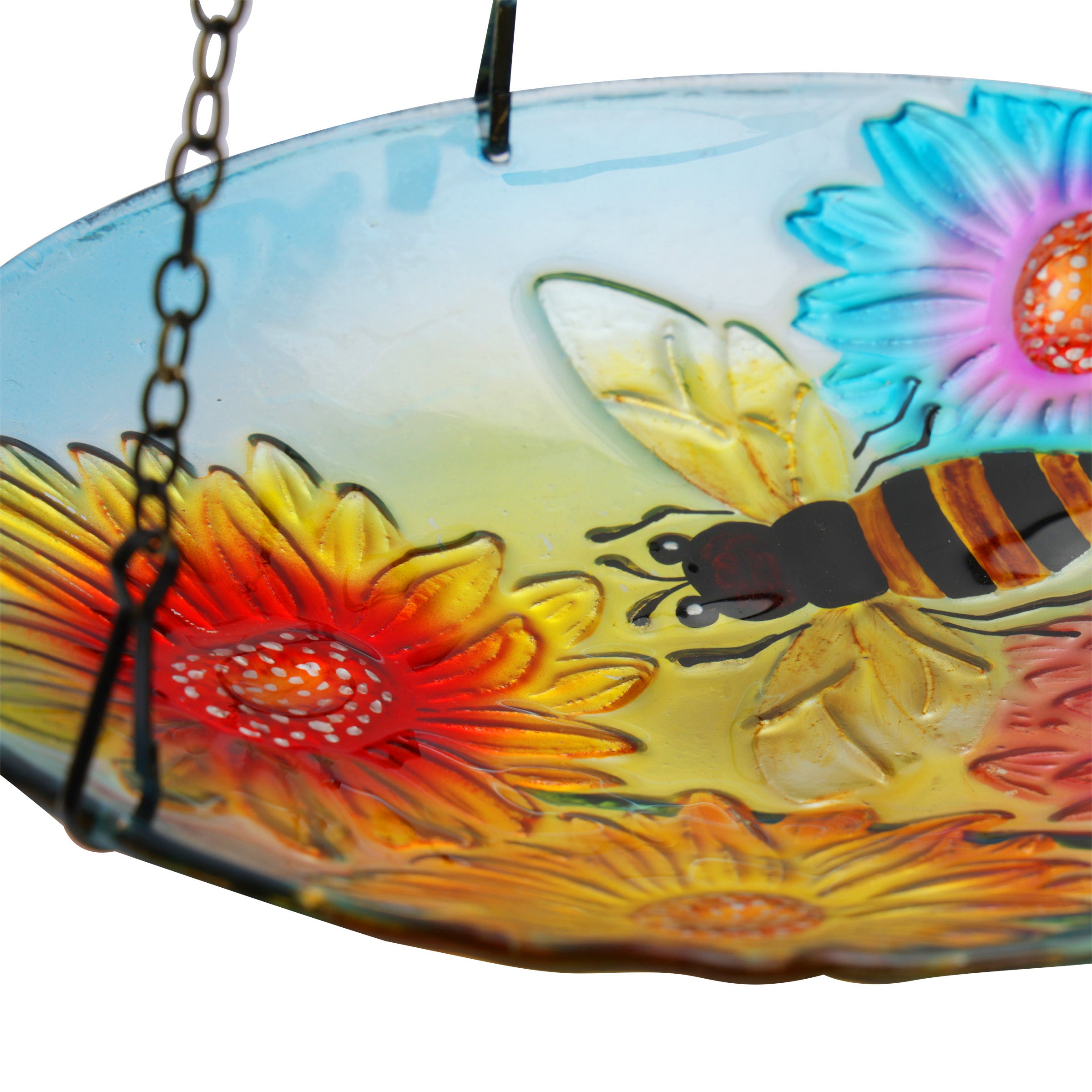 Attract all types of birds to your outdoor living space with the Alpine Corporation Flowers and Bee Hanging Glass Bird Feeder. This stunning bird feeder and birdbath captivates a variety of birds and feathered friends while bringing life to any garden, patio, backyard, or deck. Boasting a vibrant, exquisite design with intricate florals and a friendly bee, the hanging birdbath bowl creates a captivating focal point while complimenting the natural beauty of your outdoor sanctuary. Great as a birdbath or feeder, the bowl's shallow and wide profile allows multiple small birds to drink, splash, and bathe safely at the same time or can be filled with birdseeds to feed hungry birds. The bowl is crafted from durable glass to withstand the elements and measures 10" L x 10" W x 2" H for a generous and welcoming space for birds to refresh. It comes with a 23" sturdy metal chain to allow for easy hanging from a branch, hook, or any suitable outdoor structure, increasing versatility while also preventing unwanted guests from accessing the feeder. With Alpine's 1 year Support, you can shop with assurance and buy with confidence.
