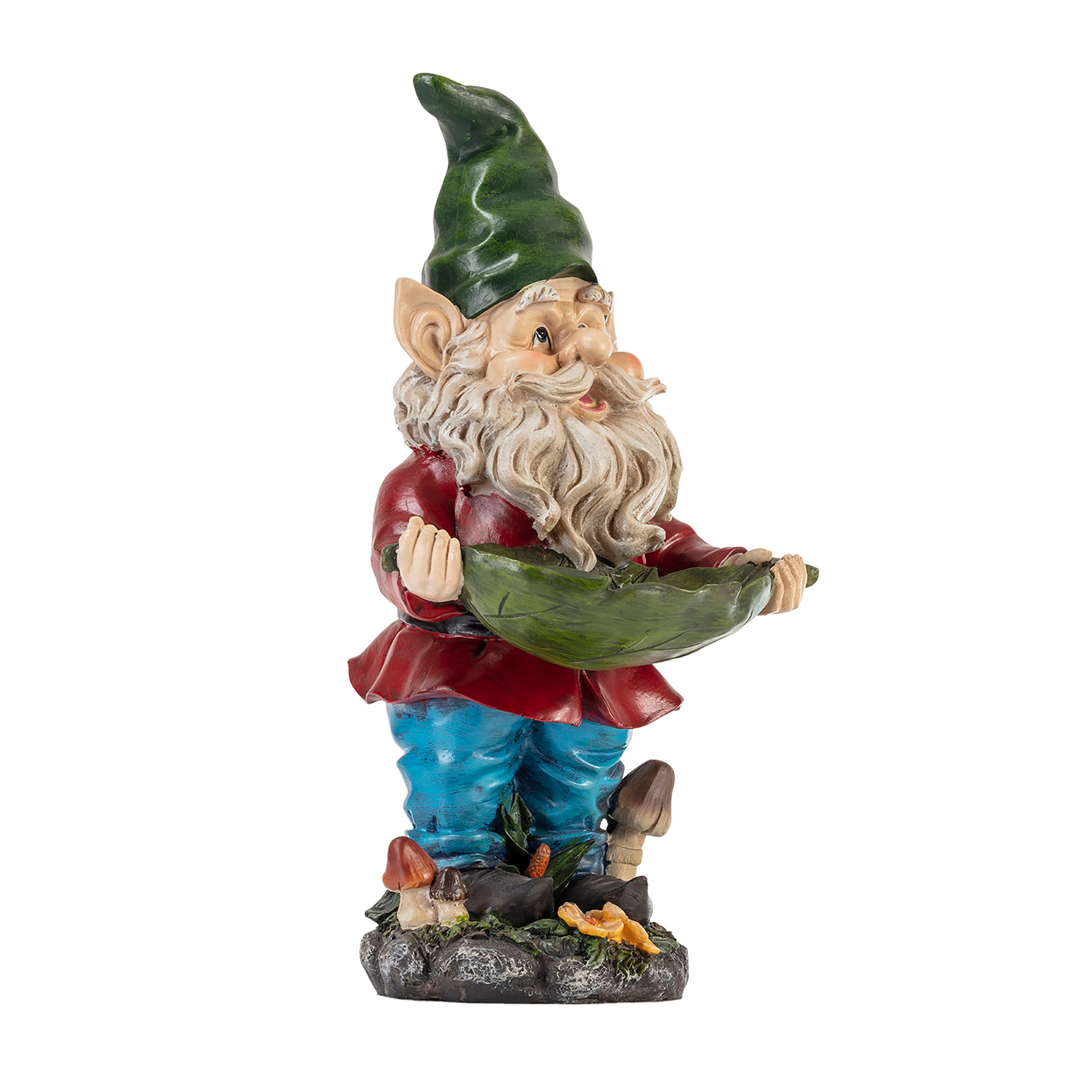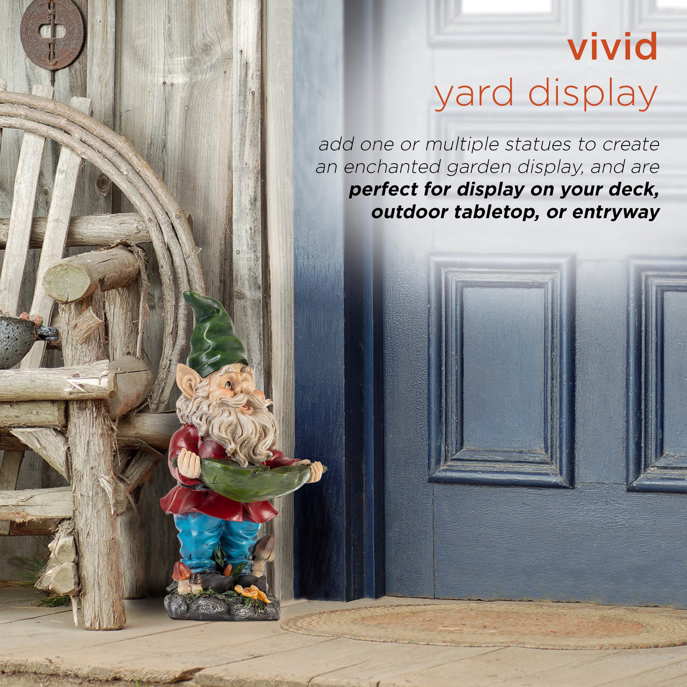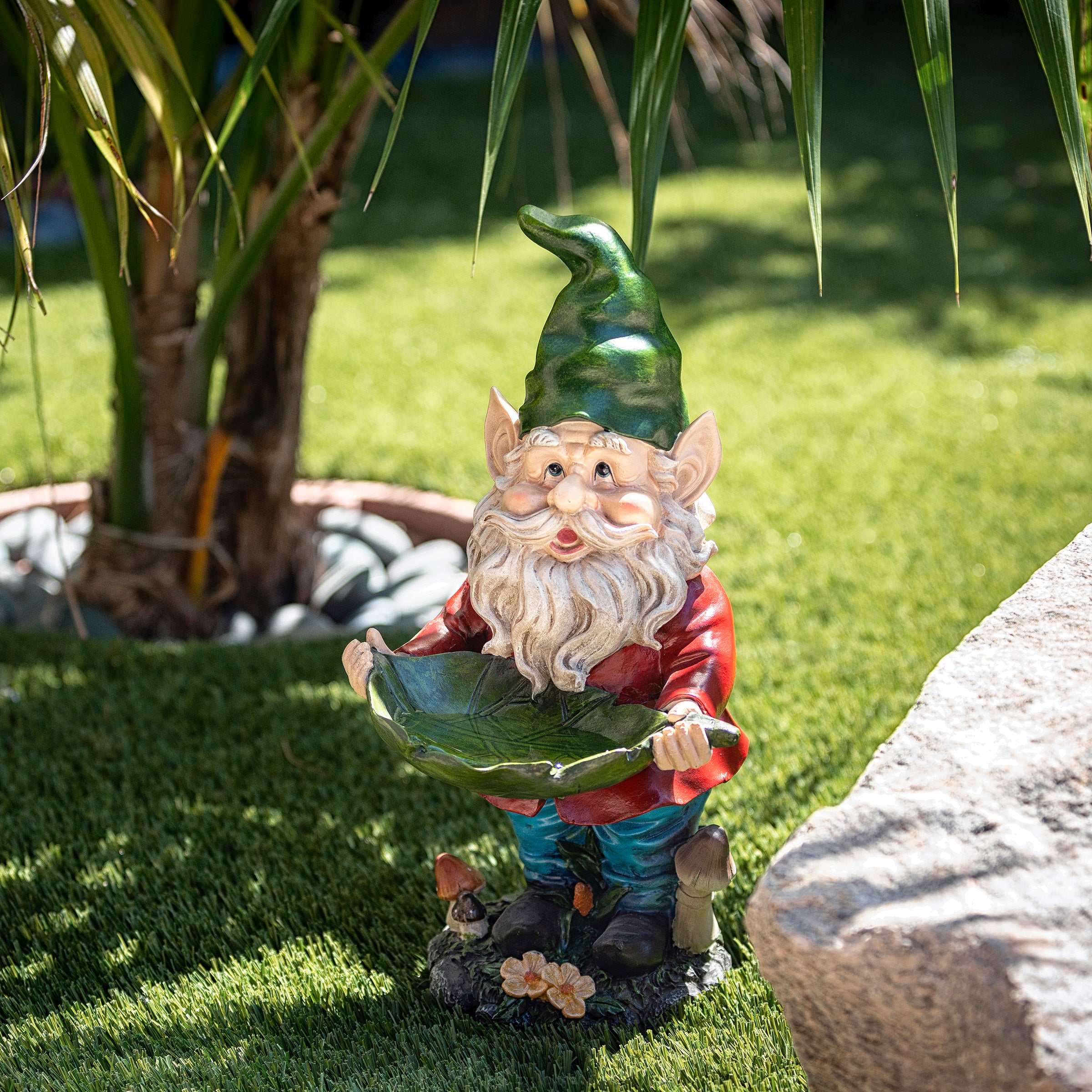 Legend has it that garden gnomes will provide you with mythical powers to keep your garden lush and green, while keeping you safe from evil spirits. With the 16" Tall Outdoor Garden Gnome and Bird Feeder Yard Statue Decoration from Alpine, you can add fun and whimsy to your outdoor area. The lawn figurine features a helpful garden gnome ready to assist you with feeding the birds as he holds a leaf bowl and can easily double as a birdbath for your feathered friends. Use the yard gnome to offer a fun and warm welcome to your home, front yard, garden, or patio. Constructed from a durable polyresin with a colorful painted finish, the yard decoration is weatherproof and rust resistant for years of quality use on your lawn or outdoor living area. The outdoor statue features intricate, life like details on the sculpture, making it ideal for placing in front of a pond or fountain to reflect their inviting and whimsical spirit. It also has a functional, shallow bird feeder basin to allow easy access for all types of birds to feed from. Add multiple statues to create an enchanted garden display and gnome community. Alpine’s gnomes are perfect for display on your deck, porch, or outdoor tabletop as a centerpiece. They can also be used as a decorative accent in your flowerbeds or in your home's interior decor. This compact outdoor statue measures 9"L x 8"W x 16"H to fit almost any indoor or outdoor space, and includes a one year manufacturer's Support from date of purchase.