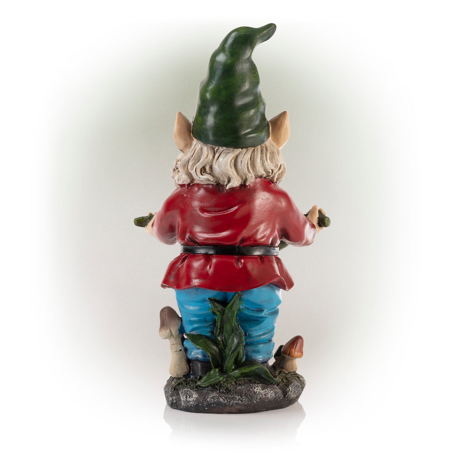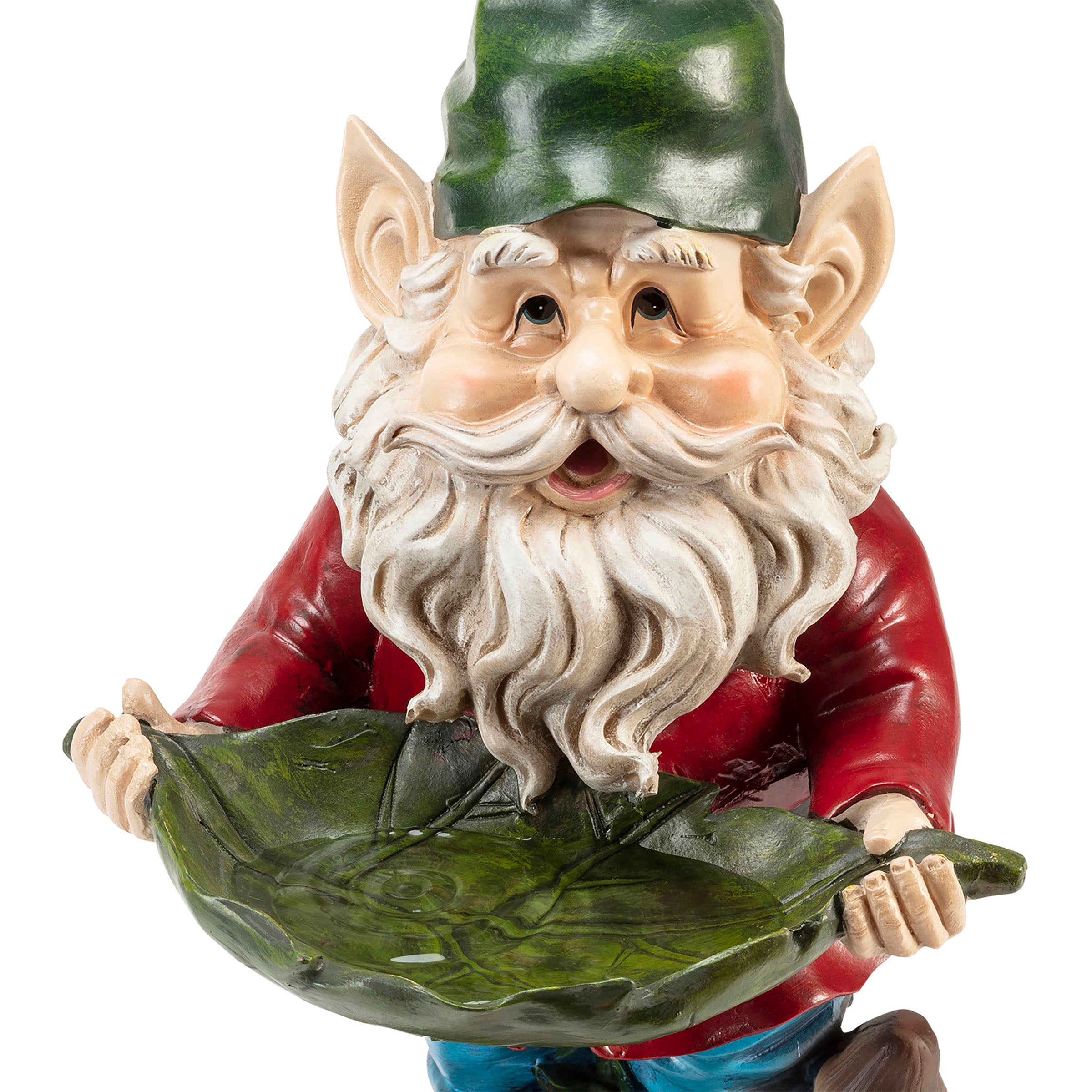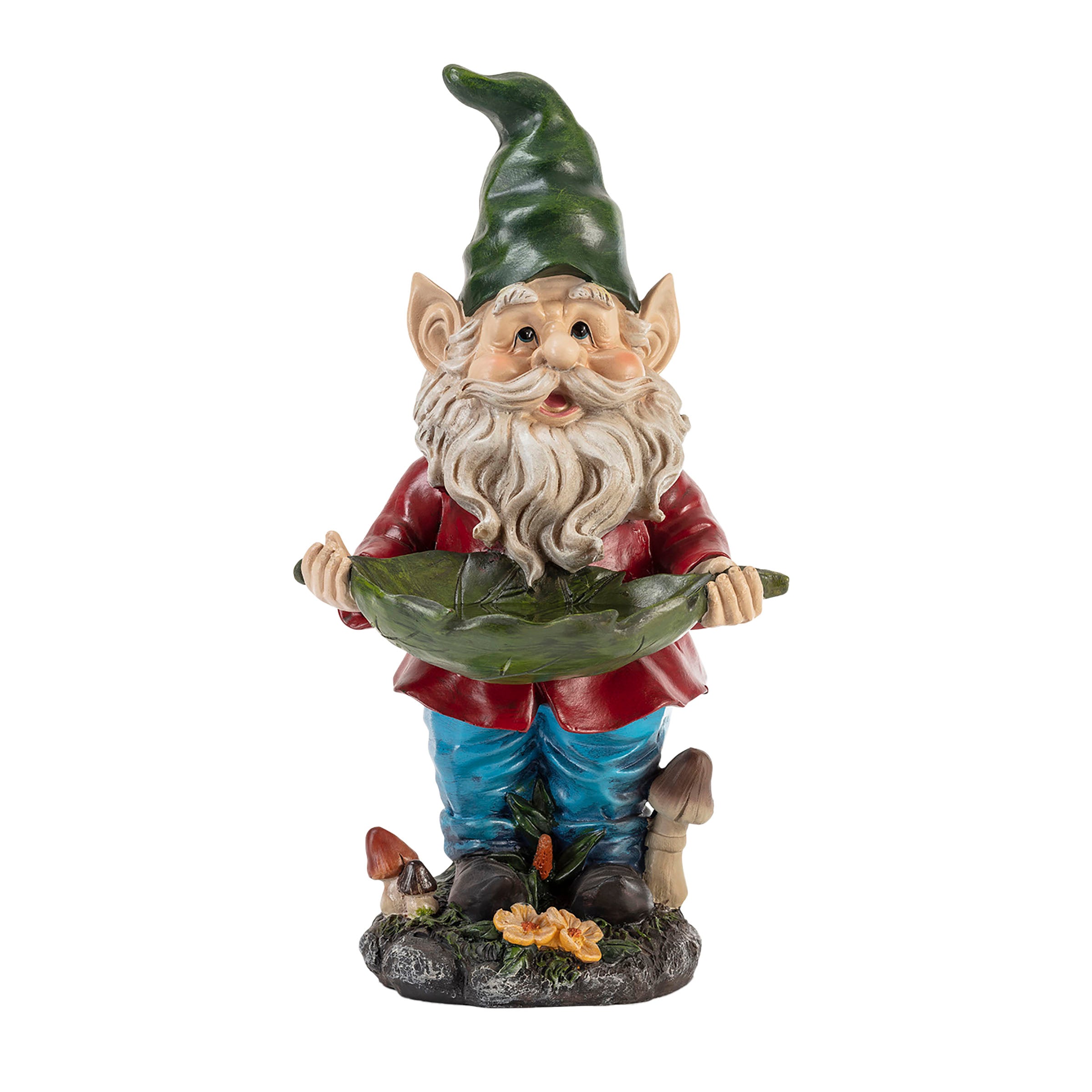 Legend has it that garden gnomes will provide you with mythical powers to keep your garden lush and green, while keeping you safe from evil spirits. With the 16" Tall Outdoor Garden Gnome and Bird Feeder Yard Statue Decoration from Alpine, you can add fun and whimsy to your outdoor area. The lawn figurine features a helpful garden gnome ready to assist you with feeding the birds as he holds a leaf bowl and can easily double as a birdbath for your feathered friends. Use the yard gnome to offer a fun and warm welcome to your home, front yard, garden, or patio. Constructed from a durable polyresin with a colorful painted finish, the yard decoration is weatherproof and rust resistant for years of quality use on your lawn or outdoor living area. The outdoor statue features intricate, life like details on the sculpture, making it ideal for placing in front of a pond or fountain to reflect their inviting and whimsical spirit. It also has a functional, shallow bird feeder basin to allow easy access for all types of birds to feed from. Add multiple statues to create an enchanted garden display and gnome community. Alpine’s gnomes are perfect for display on your deck, porch, or outdoor tabletop as a centerpiece. They can also be used as a decorative accent in your flowerbeds or in your home's interior decor. This compact outdoor statue measures 9"L x 8"W x 16"H to fit almost any indoor or outdoor space, and includes a one year manufacturer's Support from date of purchase.