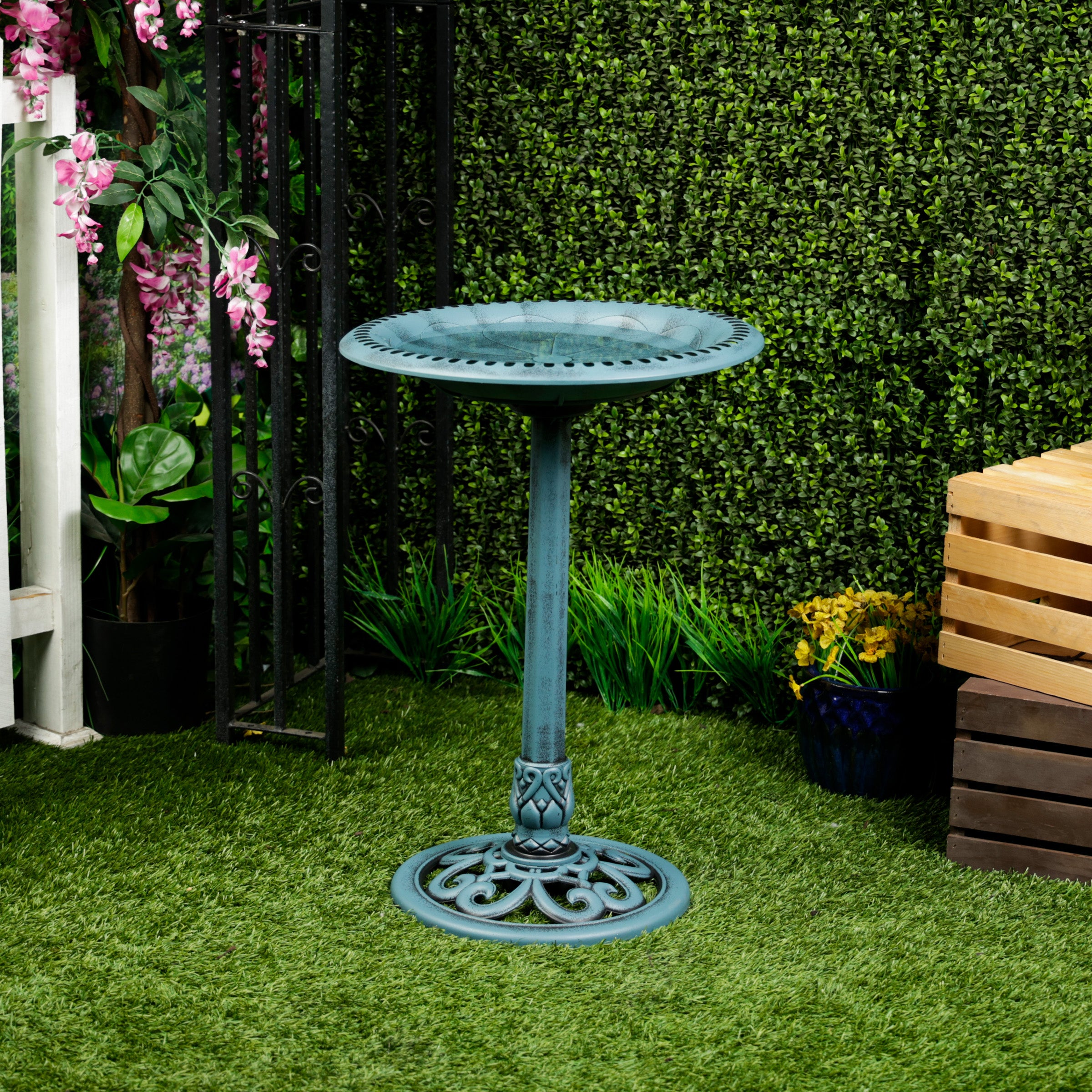 Blue Pedestal Birdbath with Scrollwork Base