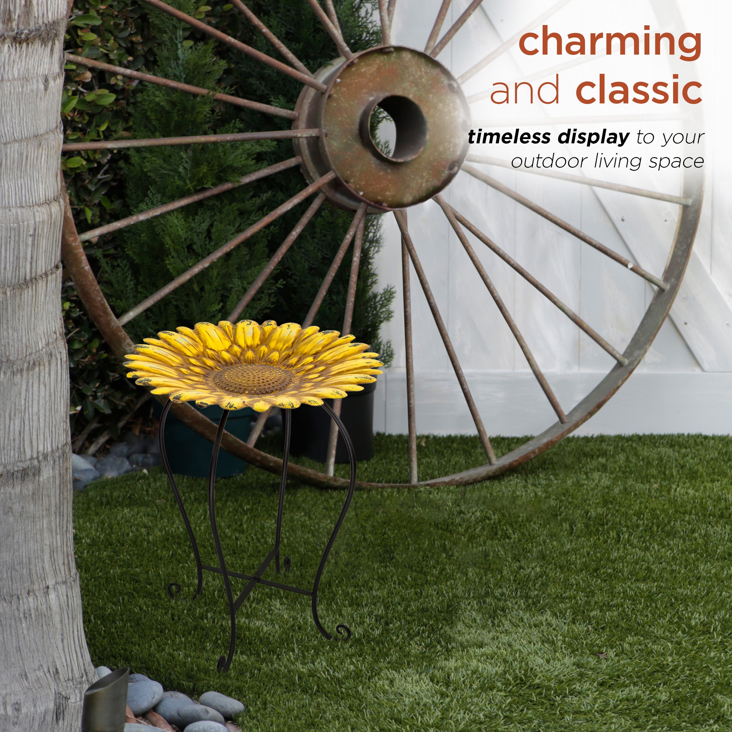 Beckon feathered friends to your yard with the Alpine Corporation 19" tall Embossed Metal Sunflower Birdbath Decoration Yard Statue! Fill the timeless and charming bath with fresh water and enjoy watching all the birds congregate near your patio, garden, deck, yard, or pool! This high quality birdbath features a stunning sunflower design to brighten your day. It is perfect for pairing with a bird feeder to coax a variety of birds outside your window during any season. It can also be used to hold birdseed in colder months when water would freeze! The sturdy base keeps the birdbath from tipping over while the sturdy construction withstands weather changes. Your yard will be the delight of humans and winged creatures alike! birdbath measures 15"L x 15"W x 19"H for use in yards of any size.