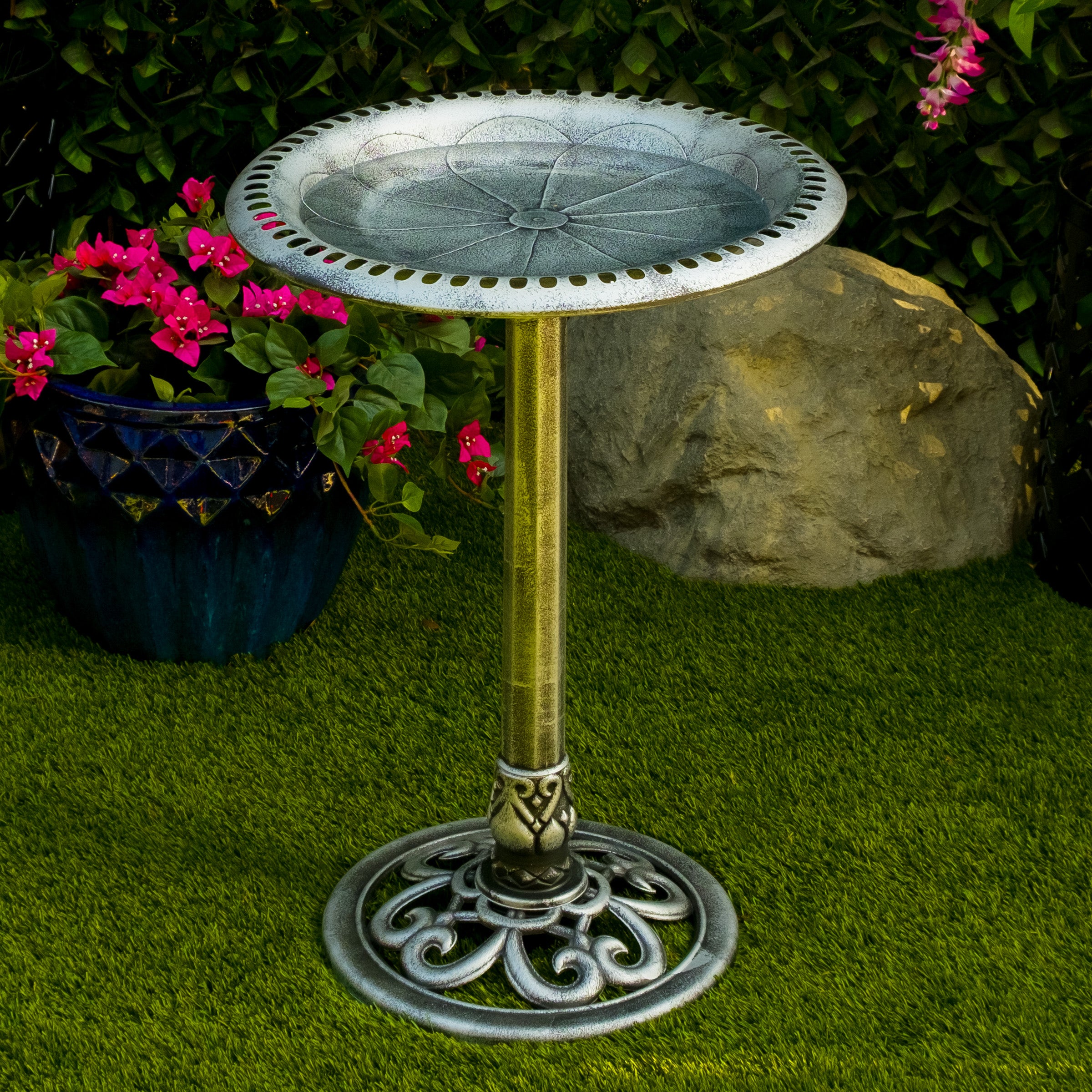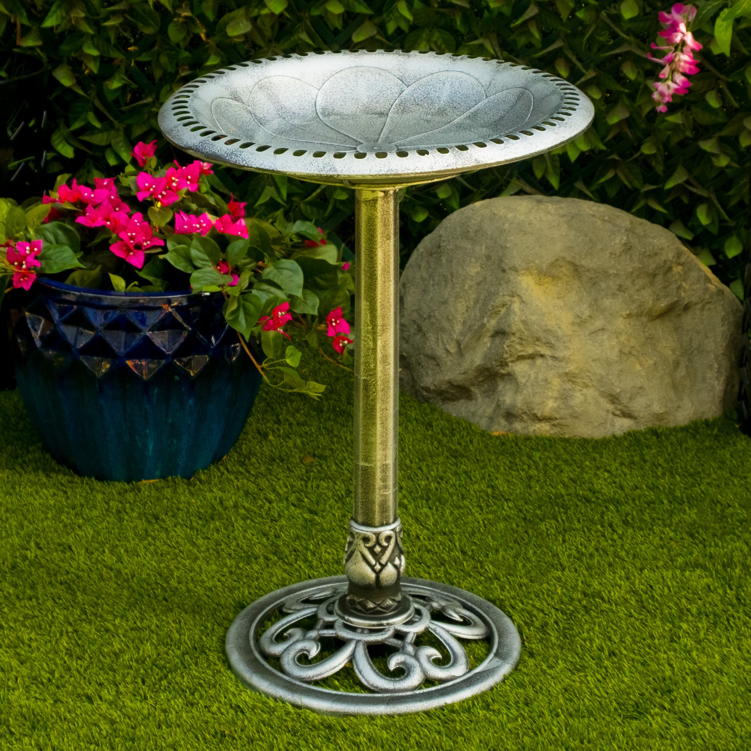 Attract all types of birds to your outdoor living space with the Alpine Corporation Pedestal Birdbath with Scrollwork Base. This stunning antique gray birdbath captivates a variety of birds and feathered friends while bringing life to any garden, patio, backyard, or deck. Boasting an elegant pedestal design with an exquisite scrollwork base, this birdbath creates a captivating focal point while complimenting the natural beauty of your outdoor sanctuary. It stands at an impressive 28" for easy bird watching, and the spacious 20" diameter basin allows multiple small birds to drink, splash, and bathe safely at the same time. Crafted with precision from heavy duty polypropylene material, this pedestal birdbath has a lightweight design for easy relocation while maintaining stability and durability year after year. Two convenient U hooks and ground stakes make setup a breeze, and you can customize the base by filling it with gravel or stones, adapting the weight to suit your preferences. With Alpine's 1 year Support, you can shop with assurance and buy with confidence.