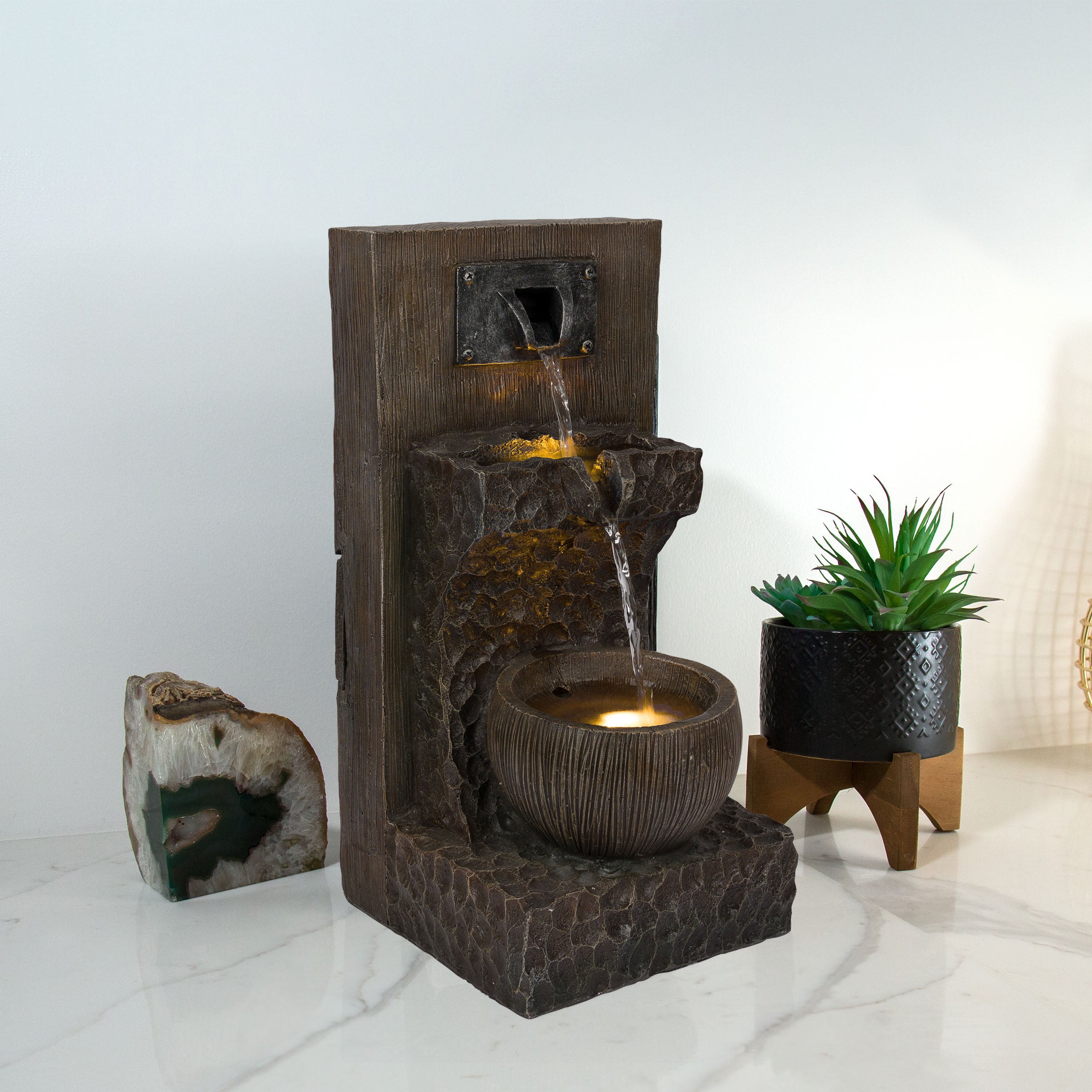 Create an enchanting ambiance in your indoor or outdoor living space with the Alpine Corporation 3 Tiered Cascading Fountain. This multi tier floor fountain transforms your indoor or outdoor oasis into a tranquil and ambient haven, making it a great addition to any modern home's patio, front porch, garden, or interior decor. Soft, natural sounds of water gently cascading down the three tiers creates a calm and relaxing atmosphere, and the charming and graceful design effortlessly compliments its surroundings. The fountain features built in warm white LED lights for an illuminated bliss in your yard, allowing you to enjoy the soothing sounds of flowing water day and night. Crafted from durable materials with meticulous attention to detail, this stylish garden fountain withstands various weather conditions to maintain its aesthetic appeal year after year in your outdoor living space. The waterfall fountain measures 10" L x 12" W x 20" H to offer a captivating yet space efficient water feature and visual masterpiece for your garden or living room. With Alpine's 2 year Support, you can shop with assurance and buy with confidence.