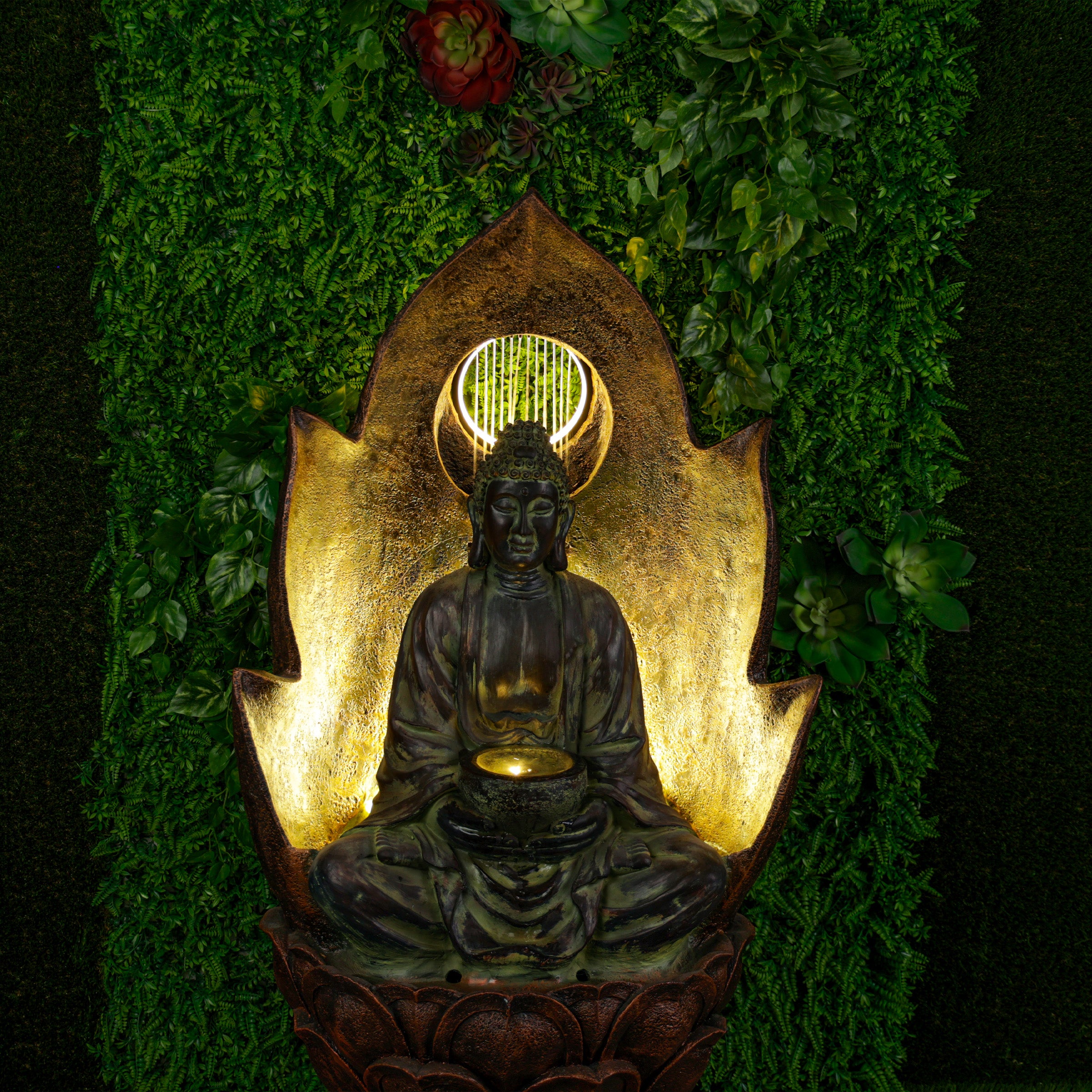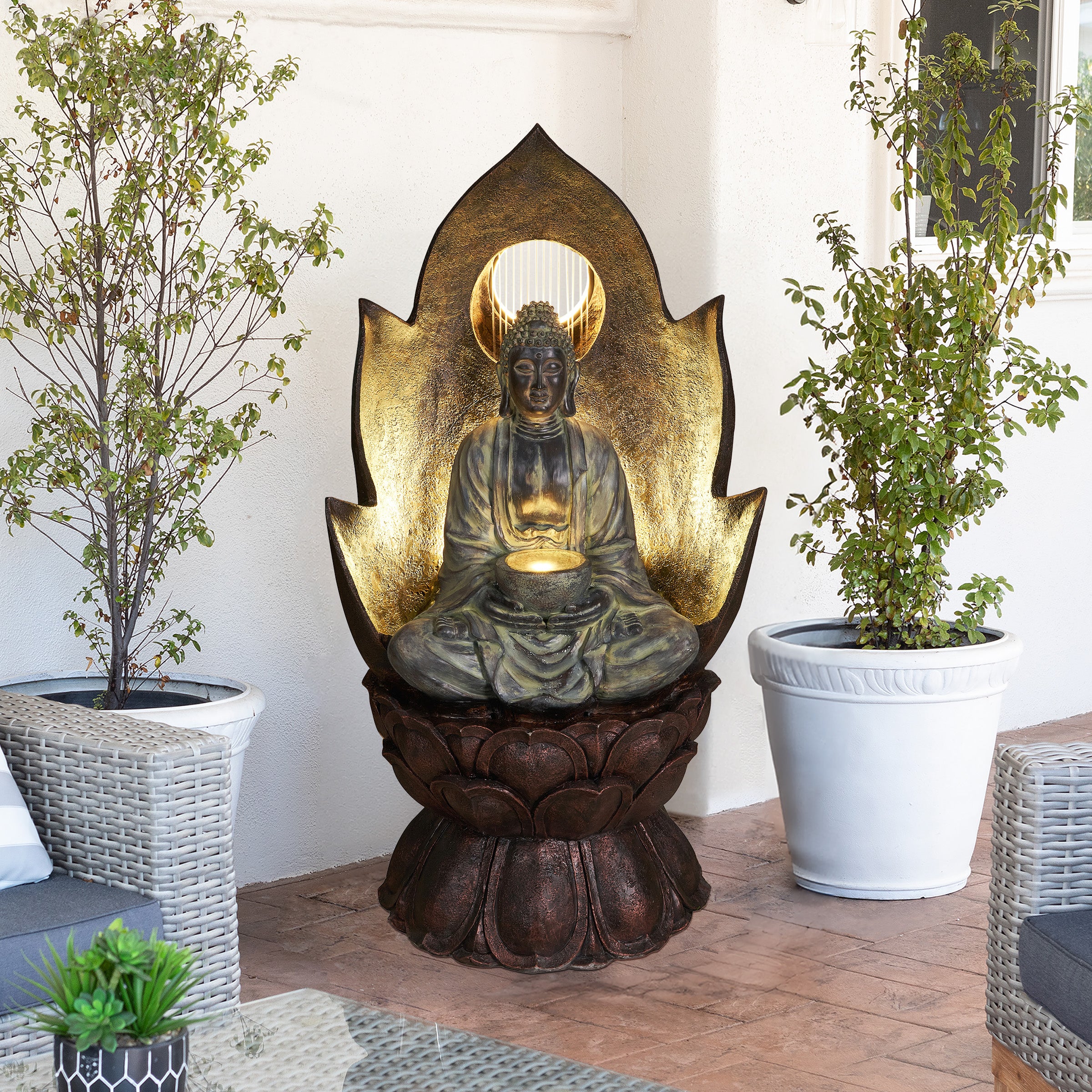 Bring peace, balance, and timeless beauty to your outdoor space with the Alpine Corporation TZL420 59" Outdoor Buddha Fountain with LED Lights, a stunning water feature designed to inspire serenity and relaxation. Standing nearly five feet tall, this majestic fountain features a beautifully detailed Buddha figure with a cascading waterfall that flows gracefully from one level to the next, creating soothing, meditative sounds that calm the mind and spirit. The natural stone-like finish adds an authentic, tranquil charm, while the gentle movement of water transforms any garden, patio, or backyard into a peaceful sanctuary. Perfect for creating a Zen-inspired atmosphere, this fountain serves as both a striking decorative centerpiece and a source of soothing ambiance that enhances your outdoor living experience day and night.