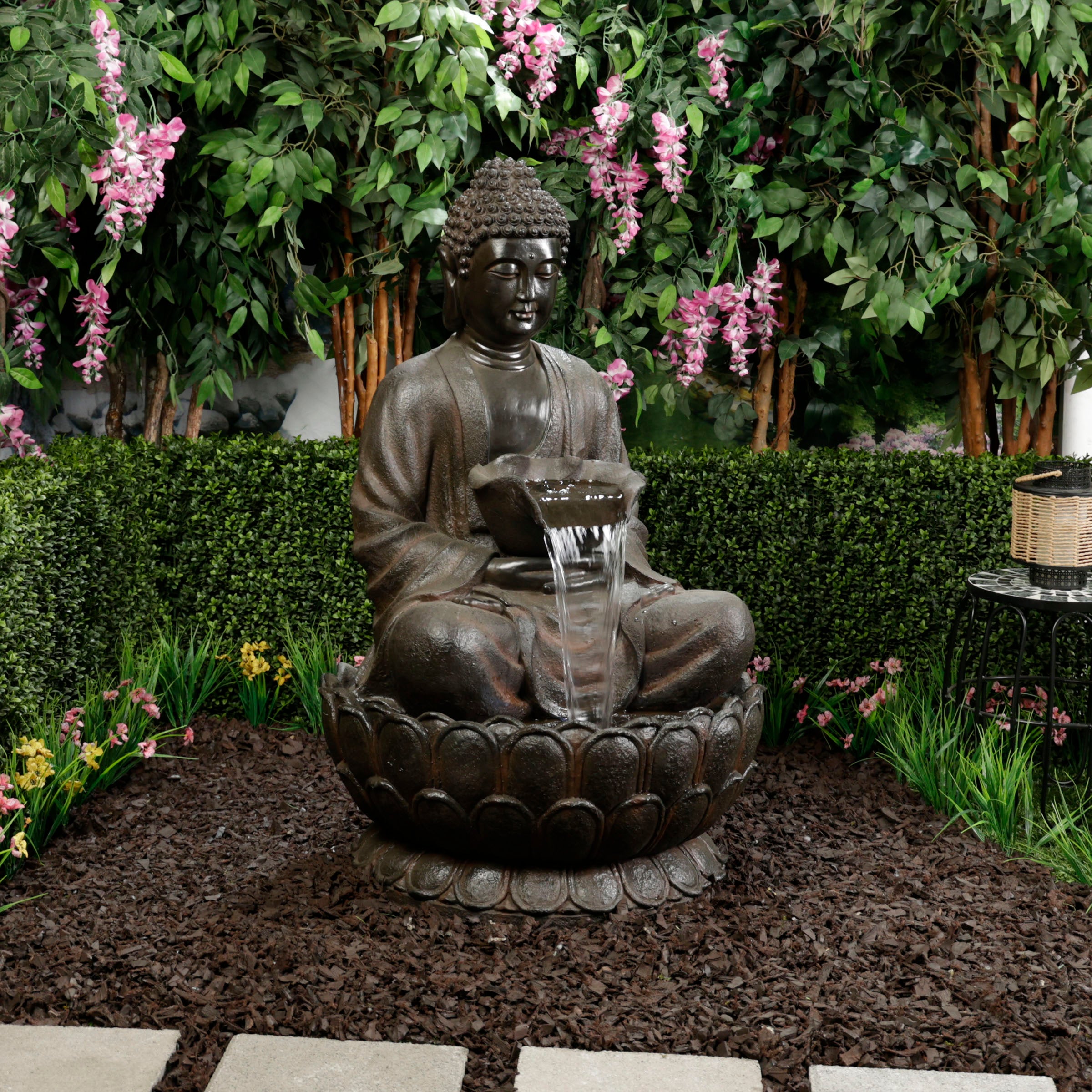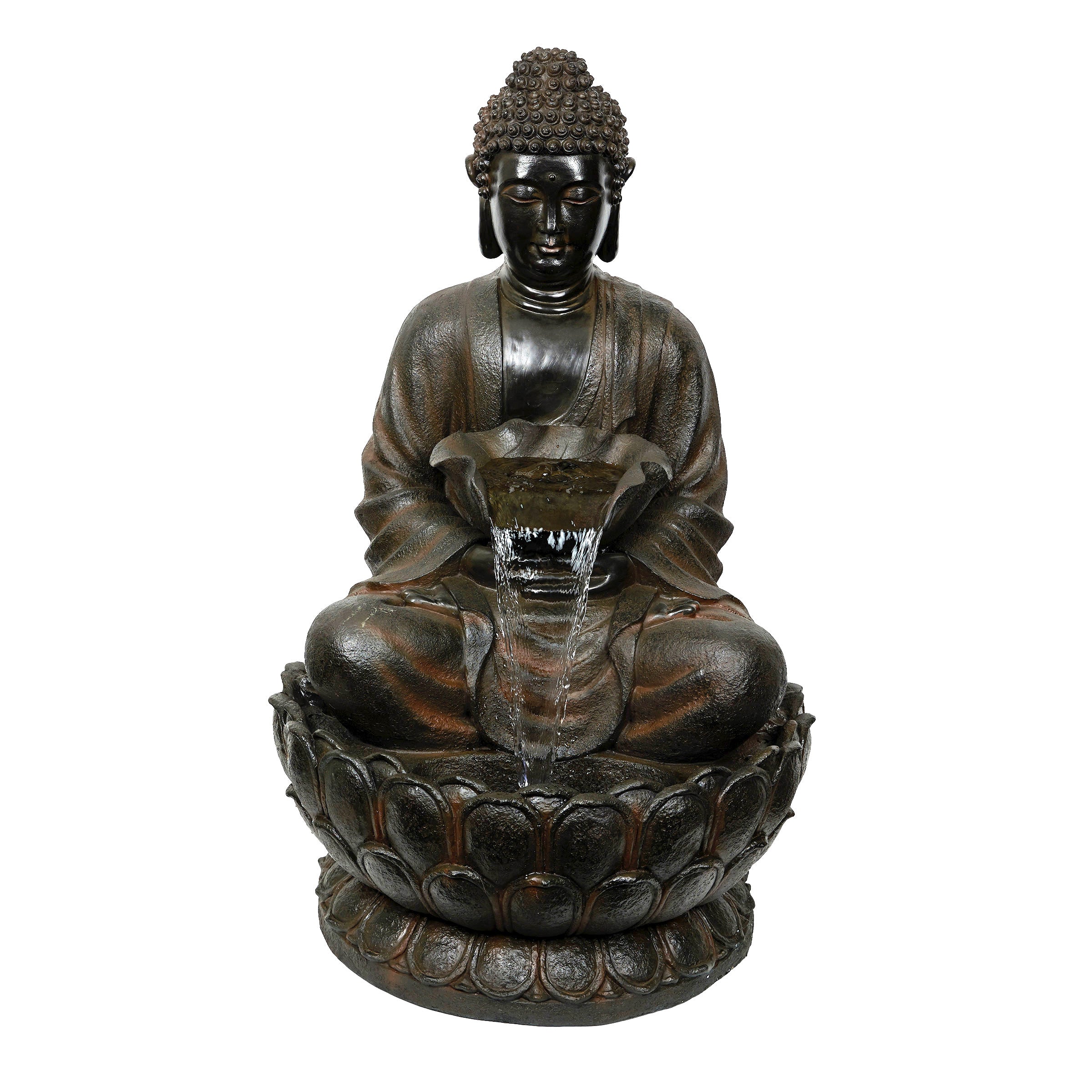 Create an enchanting ambiance in your outdoor living space with the Alpine Corporation Brown Buddha Fountain. This Buddha water fountain transforms your outdoor oasis into a tranquil and ambient haven, making it a great addition to any modern home's patio, front porch, backyard, garden, or sunroom. Soft, natural sounds of water gently cascading down creates a calm and relaxing atmosphere, and the intricately designed Buddha evokes a sense of peace and tranquility. The fountain features built in LED lights for an illuminated bliss in your yard, allowing you to enjoy the soothing sounds of flowing water day and night. Crafted from durable polyresin, this stylish Buddha garden fountain withstands various weather conditions to maintain its aesthetic appeal year after year in your outdoor living space. The waterfall fountain measures 27" L x 24" W x 44" H to offer a captivating yet space efficient water feature and visual masterpiece for your garden or patio. With Alpine's 2 year Support, you can shop with assurance and buy with confidence.