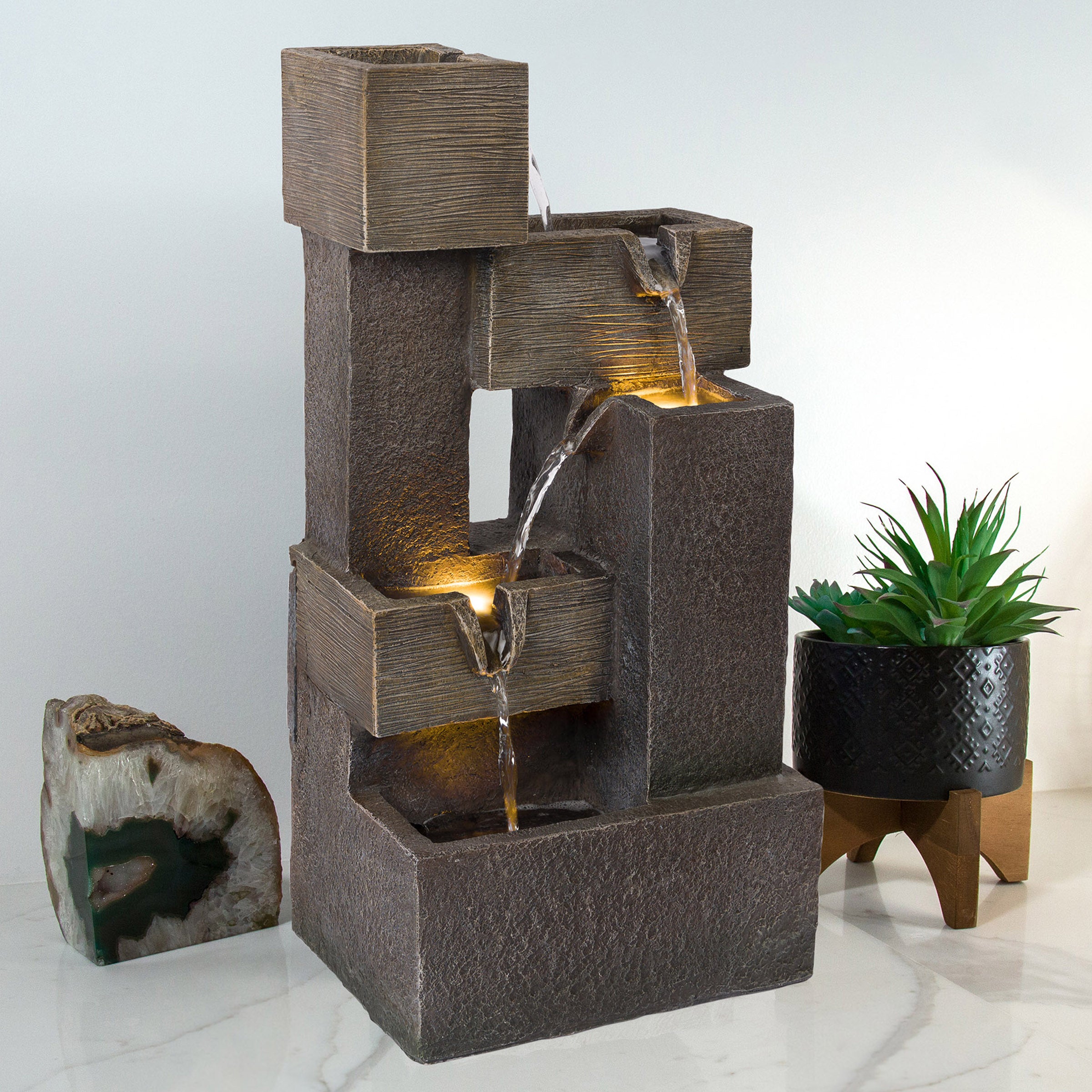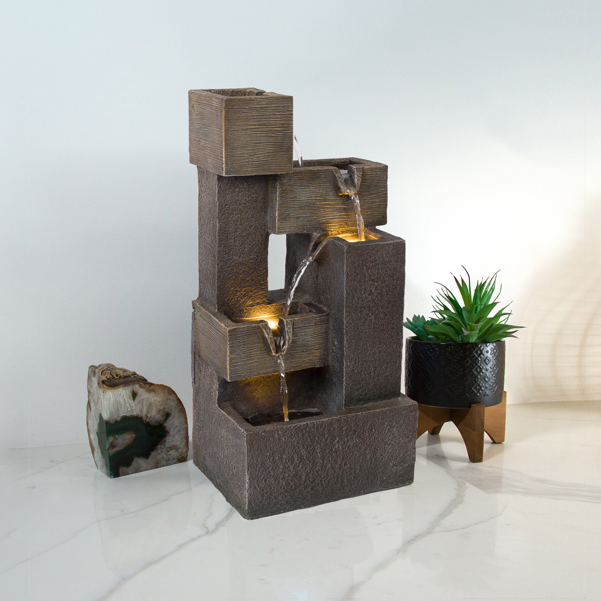 Create an enchanting ambiance in your indoor or outdoor living space with the Alpine Corporation Multi Tiered Cascading Fountain. This multi tier floor fountain transforms your indoor or outdoor oasis into a tranquil and ambient haven, making it a great addition to any modern home's patio, front porch, garden, or interior decor. Soft, natural sounds of water gently cascading down the five tiers creates a calm and relaxing atmosphere, and the elegant design effortlessly compliments its surroundings. The fountain features built in warm white LED lights for an illuminated bliss in your yard, allowing you to enjoy the soothing sounds of flowing water day and night. Crafted from durable materials with meticulous attention to detail, this stylish garden fountain withstands various weather conditions to maintain its aesthetic appeal year after year in your outdoor living space. The waterfall fountain measures 9" L x 7" W x 19" H to offer a captivating yet space efficient water feature and visual masterpiece for your garden or living room. With Alpine's 2 year Support, you can shop with assurance and buy with confidence.