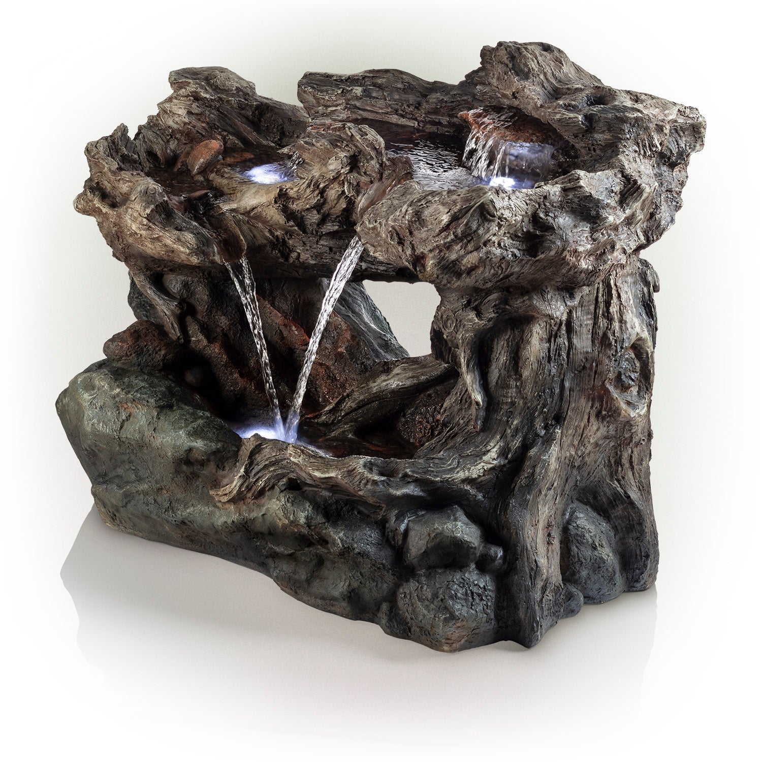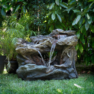 Relax and enjoy the sounds of nature with the Alpine Corporation 3 Tier Rainforest Cascading Waterfall Fountain! This outdoor fountain looks great in your garden, patio, deck, porch, or yard space. The front of the trunk opens up to reveal a gentle cascade of water that emits a calming, relaxing sound you'll love at the end of the day. Completely natural in appearance, the fountain is actually crafted of durable, weather resistant resin, stone powder, and fiberglass. LED lights in each of the 3 tiers illuminate your space, drawing attention to the relaxing water pools day or night for added ambiance. To use, simply plug into an outdoor outlet, fill lower level with water, and watch as the interior pump creates a lovely water flow reminiscent of a lush rainforest. With a 2 year Support, you can be confident in the quality of your purchase. Fountain measures 40"L x 23"W x 30"H for use in yards of any size.