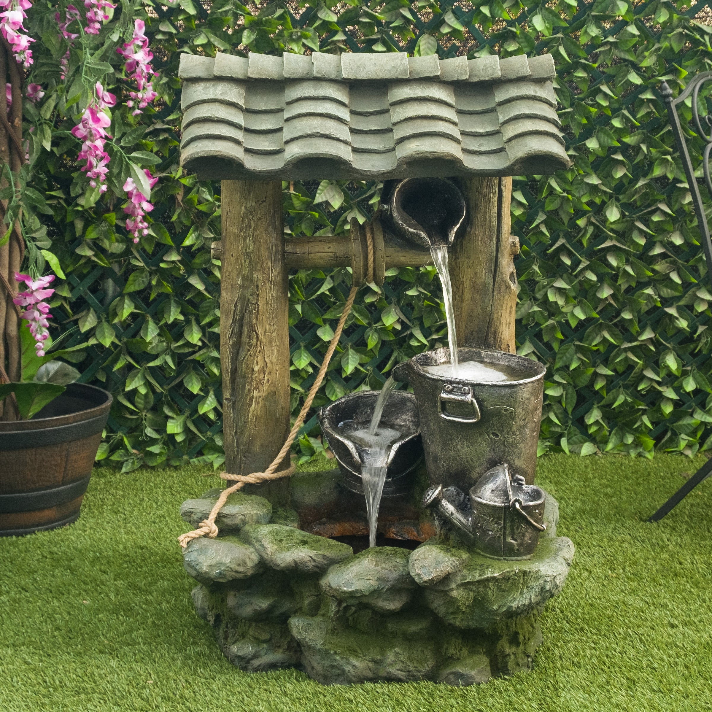 Bring tranquility to your home or garden with the Alpine Corporation Polyresin Well Fountain with LED Lights. Glowing lights come together with a serene water feature to bring a charming outdoor decoration that will help you unwind. The design adds both beauty and a peaceful sound. It’s crafted from durable polystone to help it maintain its appearance, even in the elements. Use Alpine fountain cleaner # PPL102 to fight mineral deposits and remove unwanted organic build up. The warm white LED lights illuminate the cascading water, creating a soothing and visually appealing display. Place this fountain in your garden or on your patio to create a peaceful atmosphere and bring the soothing sound of flowing water to your outdoor retreat. With Alpine's 2 year Support, you can Shop With Assurance and Buy With Confidence.