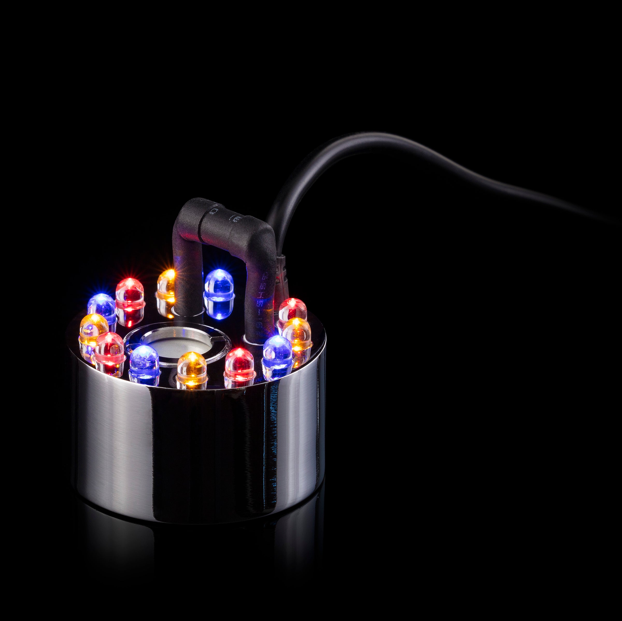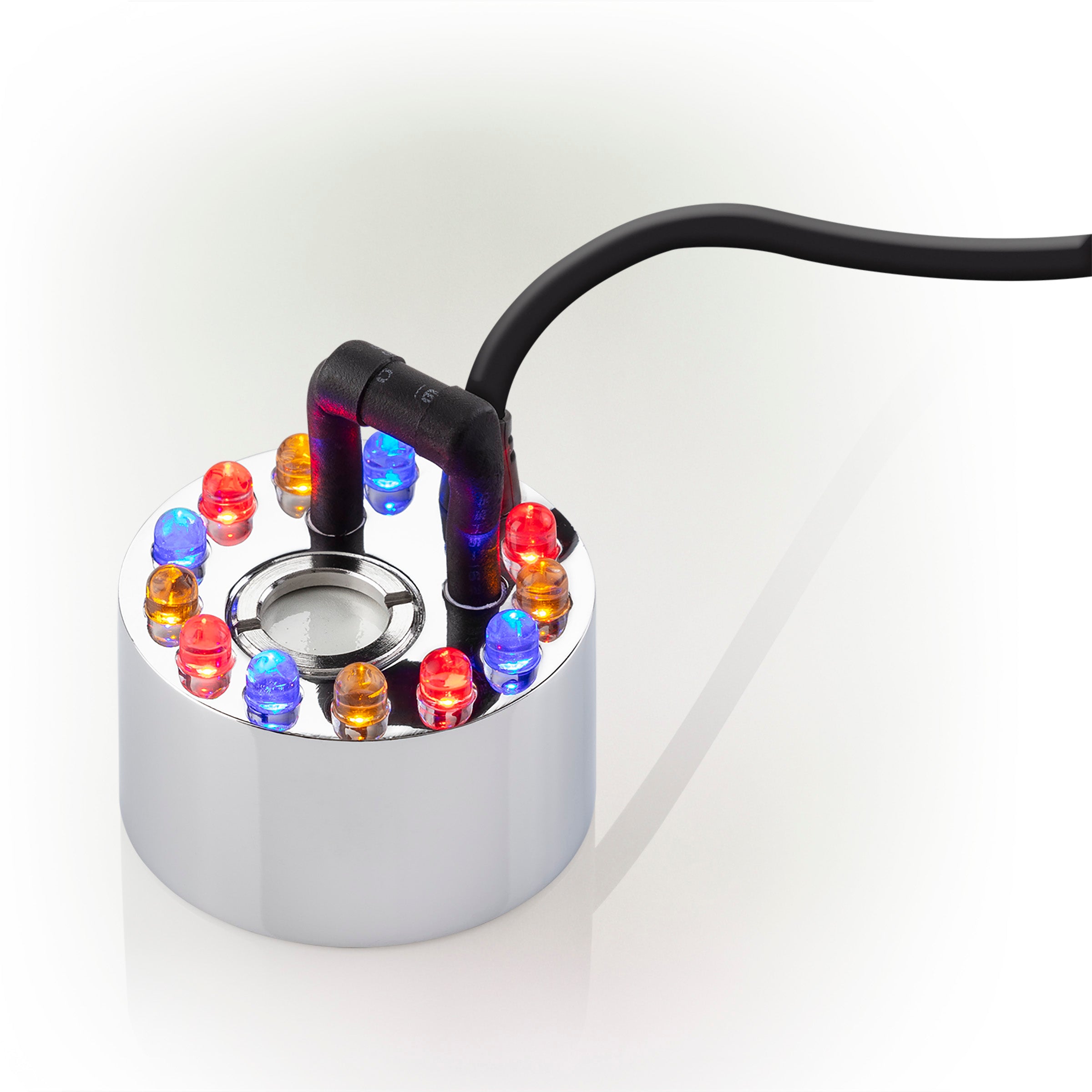 Cost saving, energy efficient, and submersible, the Alpine Corporation Single Jet Pond Fogger with Floating Ring and 12 LED Lights with Transformer Outdoor Decor Accessory is the perfect addition to your outdoor garden decor. Add special effects to your outdoor pond, fountain, or waterfalls with this submersible single jet pond fogger that adds colorful lighting and gives the effect of dry ice without the hassle. The outdoor fogger machine is like no other and emits a magical, dry ice like fog in seconds. Alpine Corporation's pond mister is great for use in outdoor or indoor ponds where fish and other aquatic life are present, and won't disrupt their environment. Illuminate your pond or outdoor fountain with the long lasting and always on 12 LED lights. These bright LEDS help create a beautiful outdoor display of light and features red, blue, and yellow lights. The pond fogger LED ring light will dazzle your guests and bring the magic of nature to your own backyard. For quick install and convenient decorating, everything is included with your purchase, and is as simple as plugging in, placing in the water, and waiting for fog to appear. The Alpine Corporation Single Jet Pond Fogger with Floating Ring and 12 LED Lights measures 2"L x 2"W x 2"H, making it the ideal pond fogger for your fountain, pond, or waterfall, and includes a one year manufacturer's Support from date of purchase.