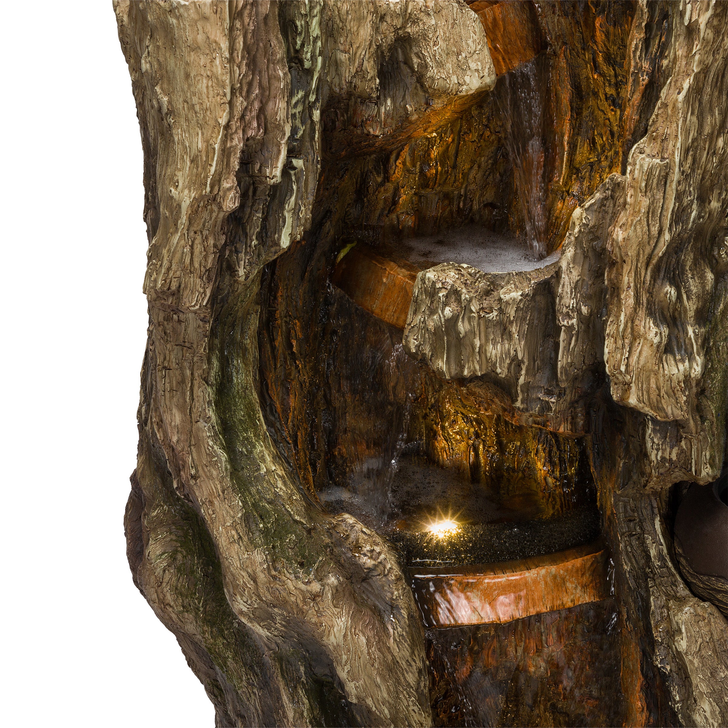 Unplug from the day and meditate to the sound of flowing water with Alpine’s 52" tall Indoor/Outdoor Waterfall Cascading Tree Fountain with Flower Pots and LED Lights. This relaxing floor fountain statue provides a tranquil and soothing addition to your yard, porch, or patio. Constructed from durable polystone and fiberglass, the fountain is weatherproof, rust resistant, and resilient for use in your home's interior décor or outside. This unique and versatile decor piece includes 4 warm white LED lights for a tranquil and soothing addition to your home’s backyard or indoor decor. Replicating a forest scene, the fountain has a natural appearance and realistic wood textures. Relax to the sounds of the calming natural water flow as it trickles cascades down and plant your favorite plants in the included flower pots. For quick installation and convenient operating, the fountain includes all necessary parts, including a pump, to begin creating an outdoor oasis. This fountain measures 22"L x 20"W x 52"H to fit almost any indoor or outdoor space and includes a two year manufacturer's Support from date of purchase.