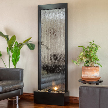 Tall Zen Indoor/Outdoor Mirror Waterfall Floor Fountain with Stones and Lights