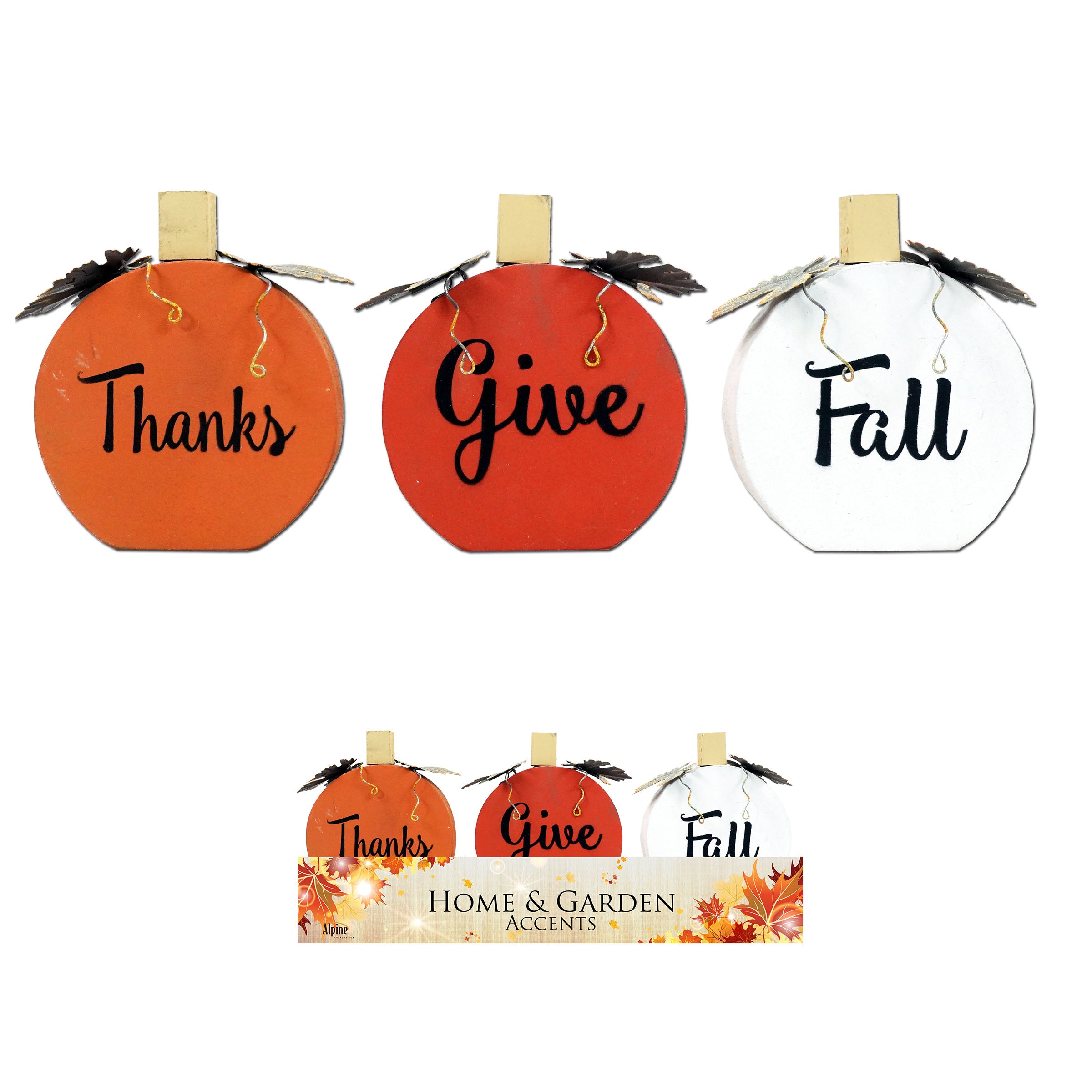 Alpine Corporation 15"L Wooden Pumpkin Decor with Metal Leaf- Asst'd Tray Pack of 12