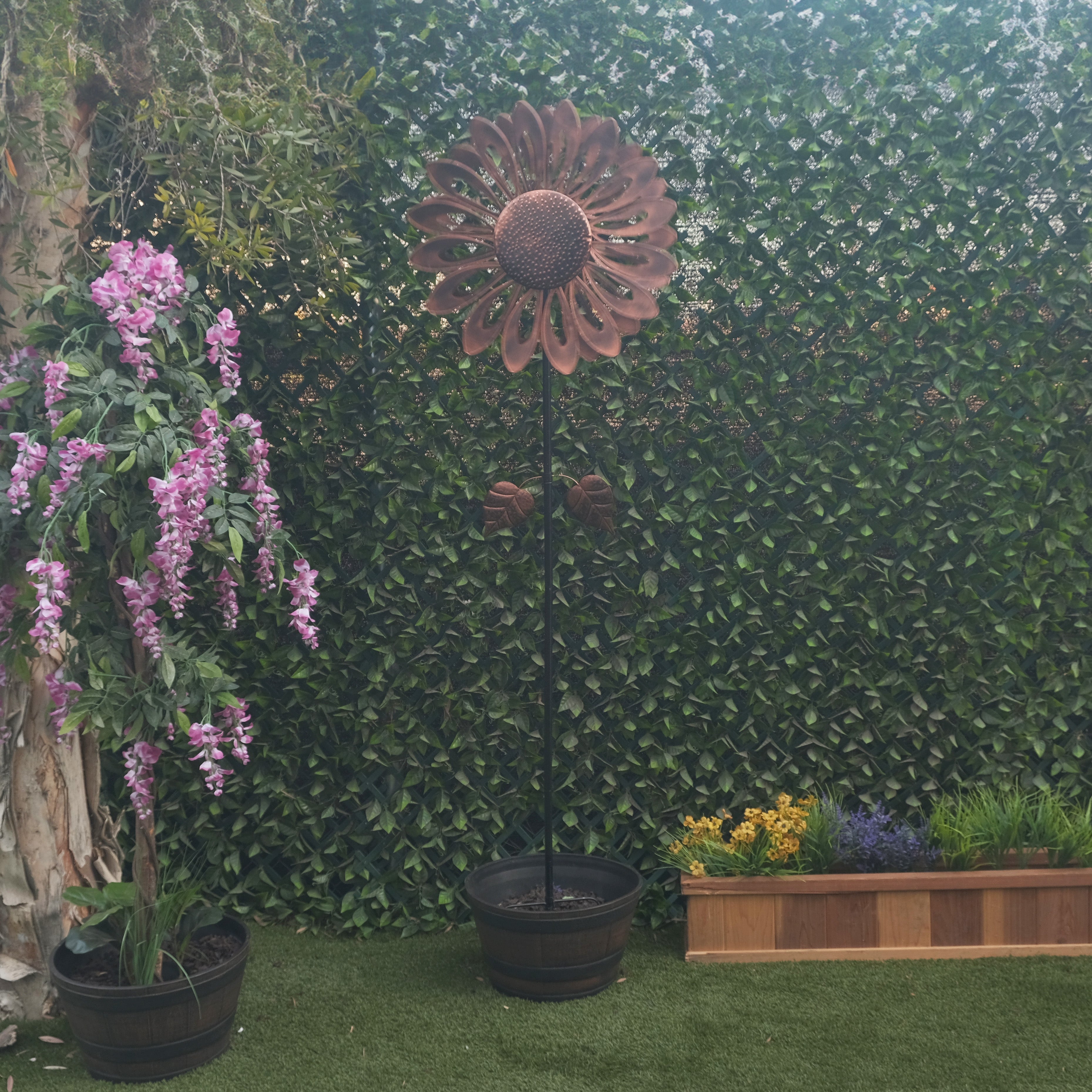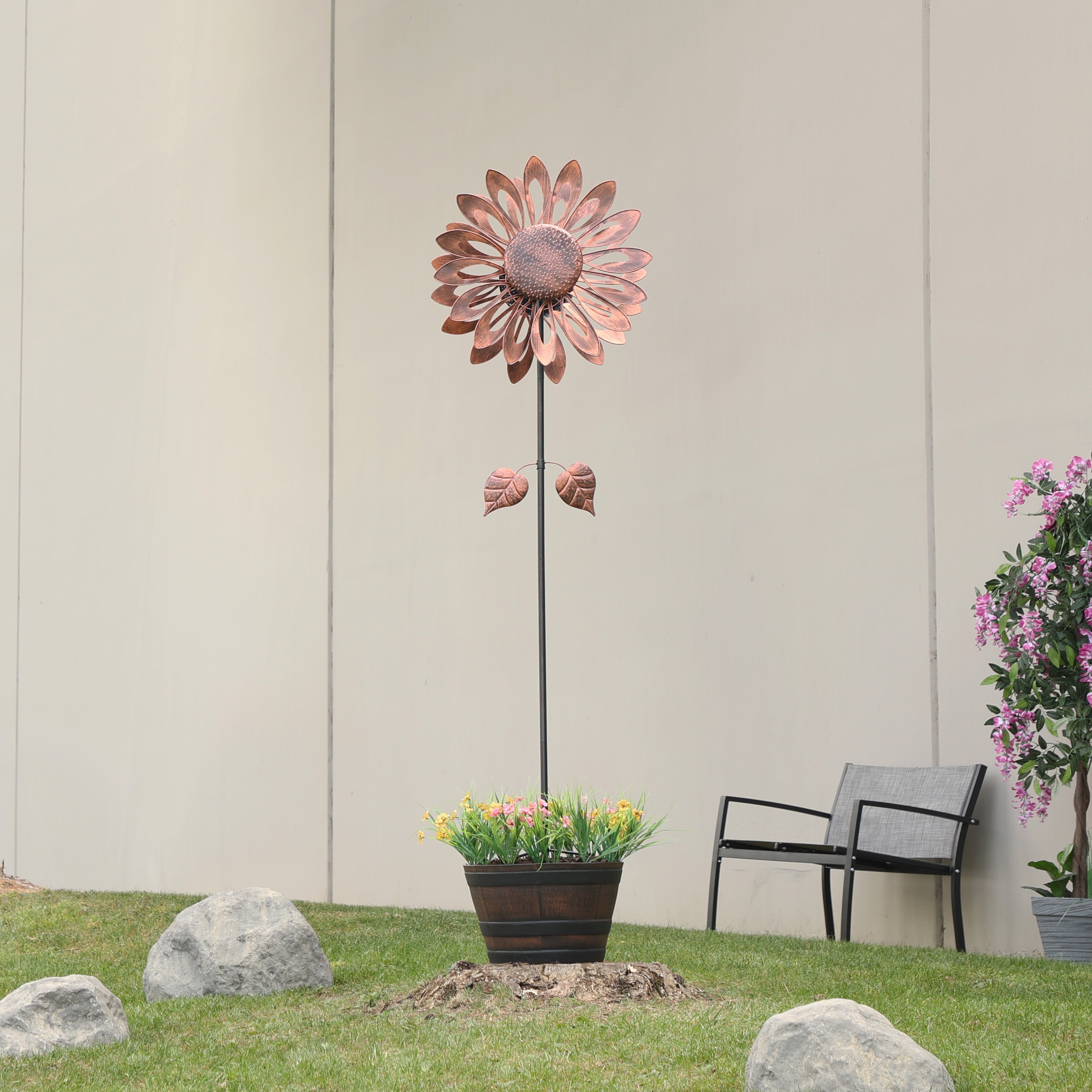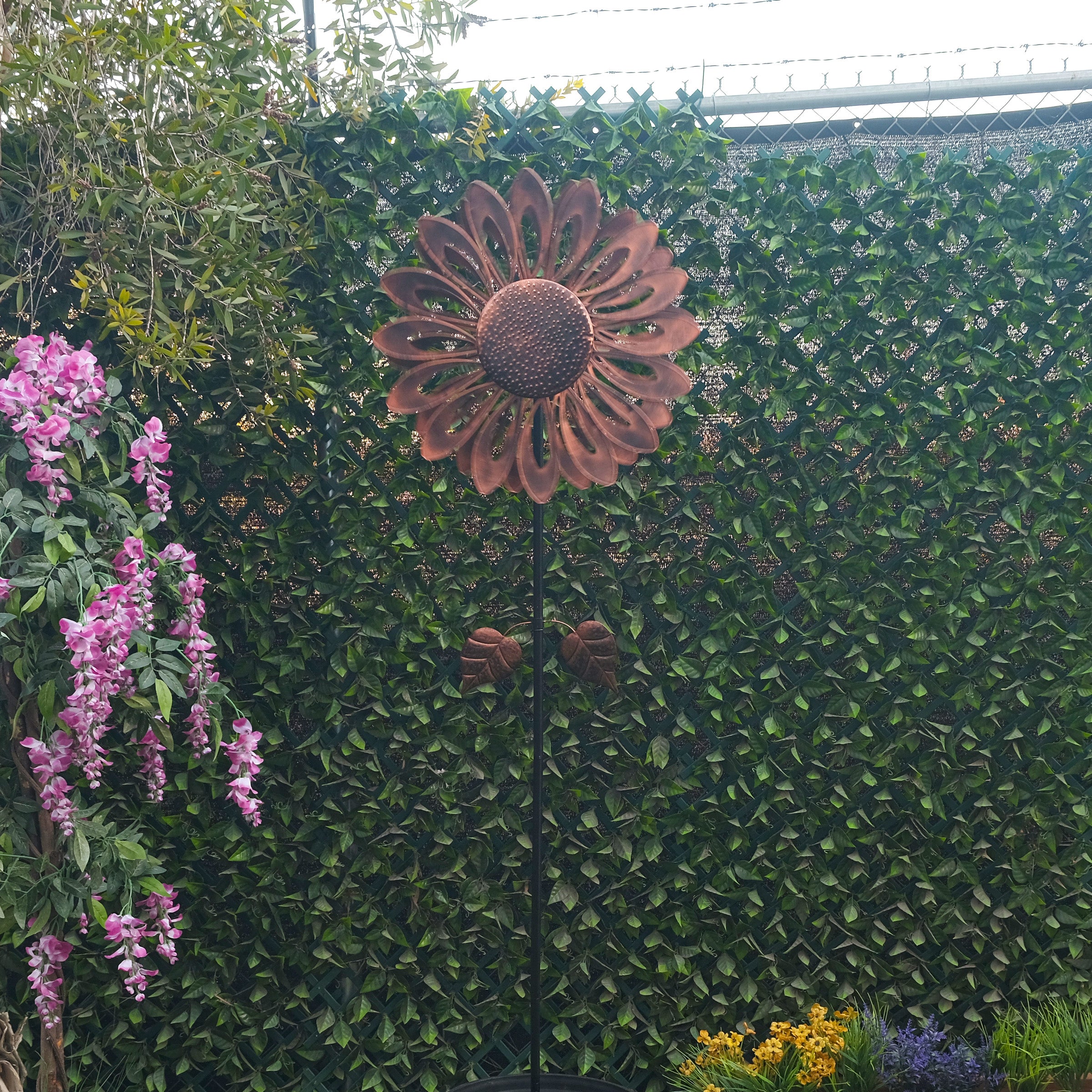 Add a burst of color and dynamic motion to your outdoor space with the Alpine Corporation Sunflower Wind Spinner Garden Stake. Standing at an impressive 85 inches tall, this beautiful garden stake will make an instant statement in your garden, lawn, or patio. Featuring an elegant bronze sunflower design, this kinetic wind spinner not only adds vibrant color but also creates a mesmerizing spinning effect in the breeze, bringing movement and charm to your outdoor décor.