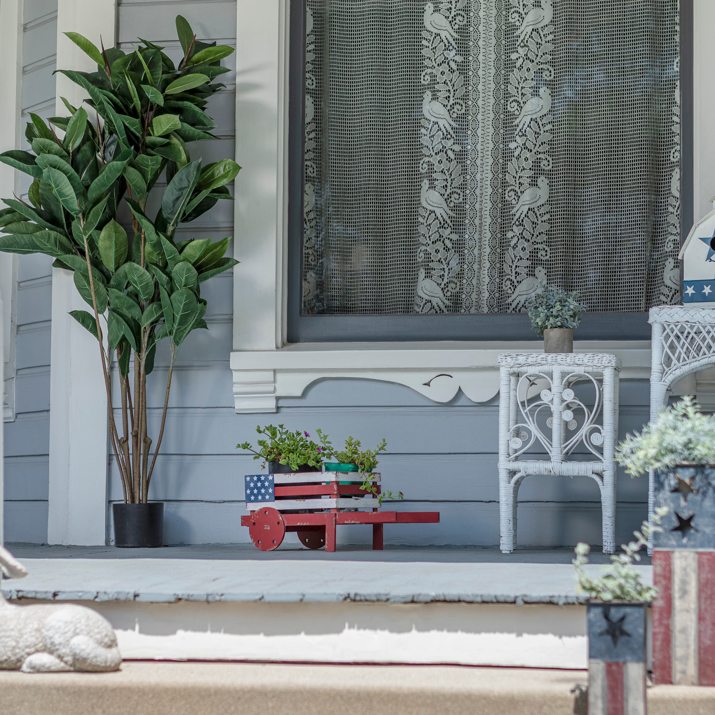 Create an inviting walkway or enhance your garden’s natural beauty by adding this 9" tall Indoor/Outdoor Rustic Wooden American Flag Wheelbarrow Planter from Alpine Corporation. This weathered finish planter in the shape of a wheelbarrow, a symbol of American culture, will add a unique and patriotic addition to your indoor or outdoor home décor. Skillfully crafted from wood with a distressed, weathered appearance, the planter has a rustic painted finish featuring an American flag motif. This durable wheelbarrow planter will provide long lasting quality use in your garden or home's entryway. Due to its versatile functions, you can include this planter along your home’s pathway or in your award winning flowerbeds as a decorative accent to display your lush, green plants and exotic flowers. It can also be used in your living room, foyer, or family room as an accent piece. Add one or multiple planters with your favorite plants and flowers to add all American style to your garden or courtyard. The worn in finish adds visual interest to home interiors and exteriors. The compact planter measures 21"L x 9"W x 9"H to fit almost any indoor or outdoor area, and includes a one year manufacturer's Support from date of purchase.