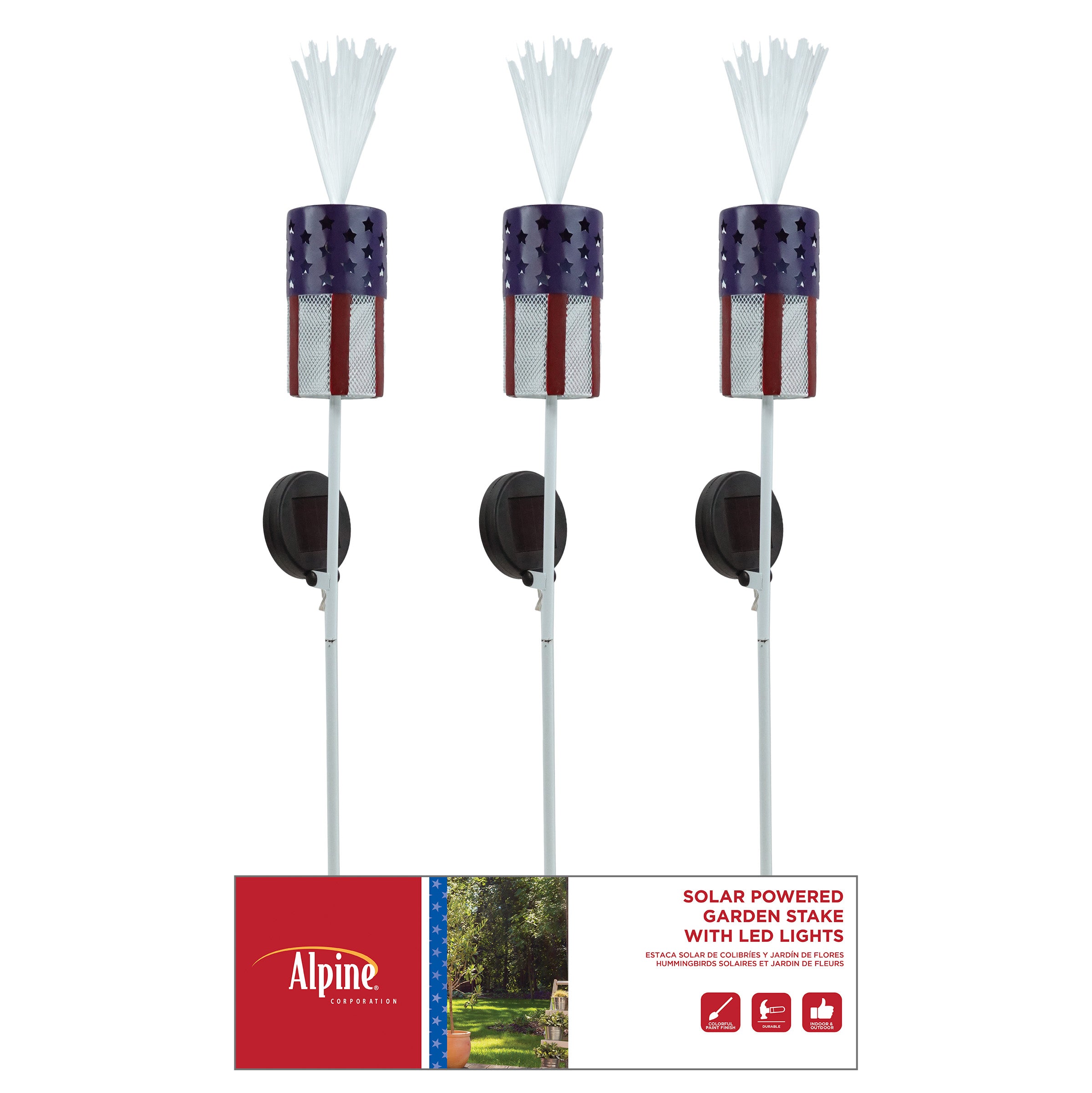 Solar Metal Flag Firecracker Stake w/ LED Light -Tray pk of 9