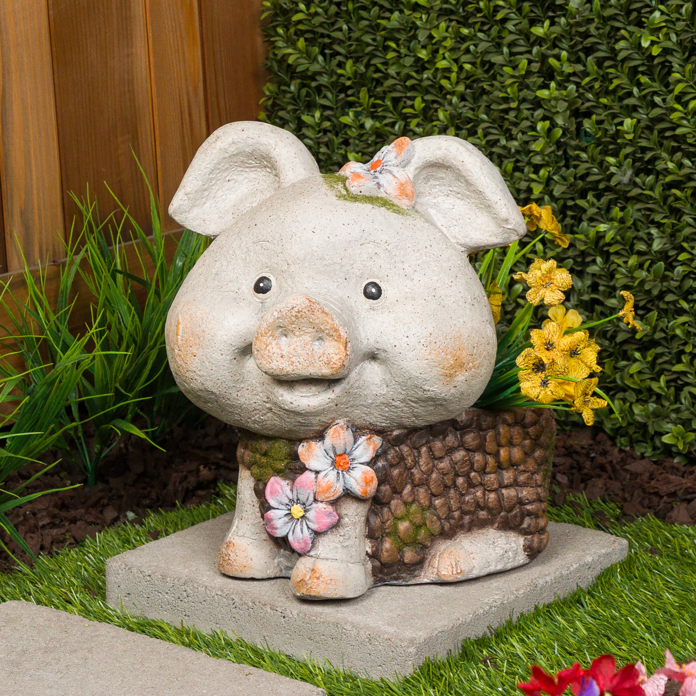 Let the Alpine Corporation Smiling Pig Statue Planter with Drainage Hole become your new favorite flowerpot. This MGO planter creates optimum conditions for a variety of plants. It’s crafted to be sturdy and last for years to come, even when left in the elements. Measuring 12"L x 11"W x 13"H, this adorable planter is perfect for showcasing your favorite small plants, succulents, or herbs. Whether placed on a patio, porch, or in the garden, the Smiling Pig Statue Planter is sure to capture the hearts of nature enthusiasts and gardening enthusiasts alike. With Alpine's 1 year Support, you can Shop With Assurance and Buy With Confidence.