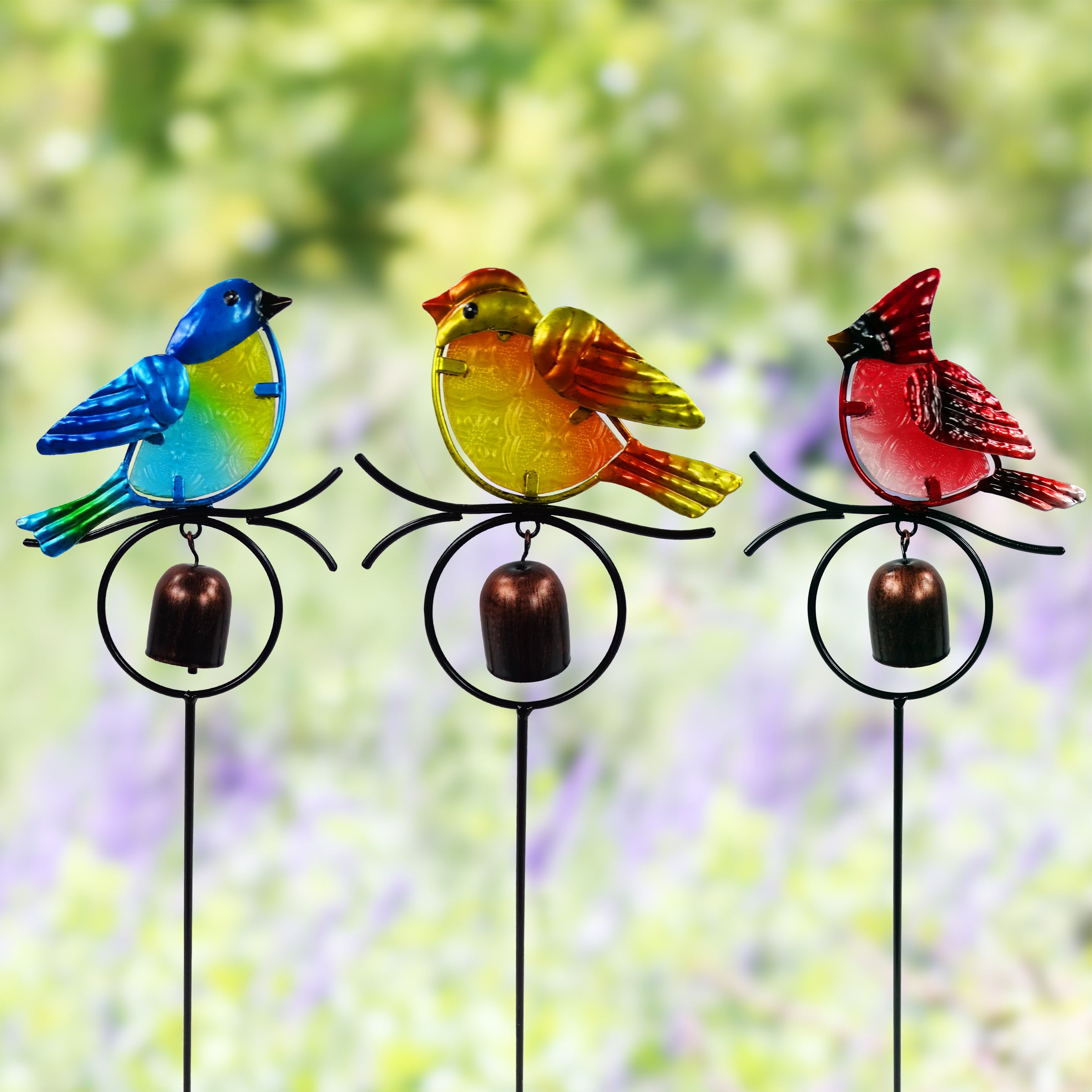 Metal & Glass Bird Pot Sticker w/Bell - Tray Pack of 24