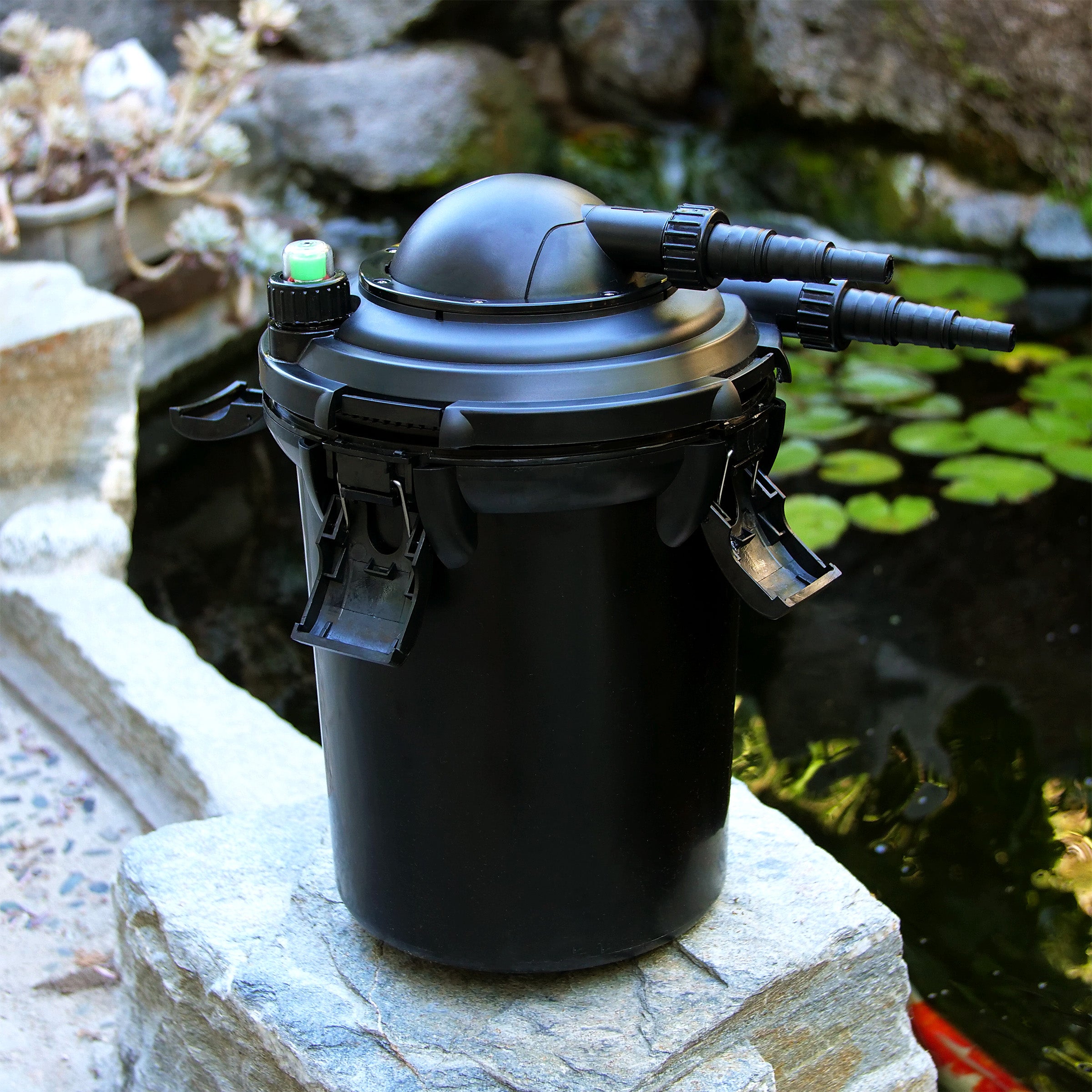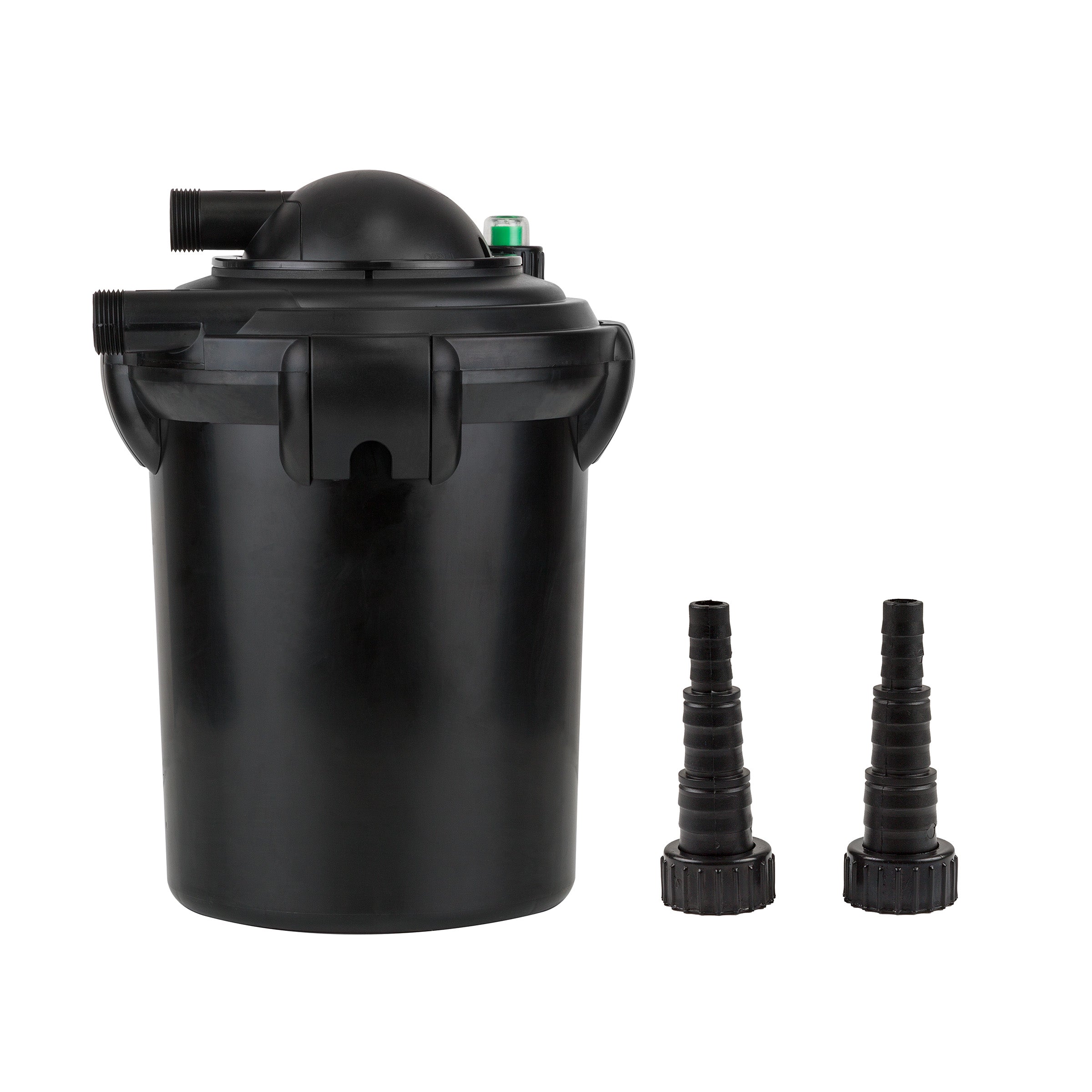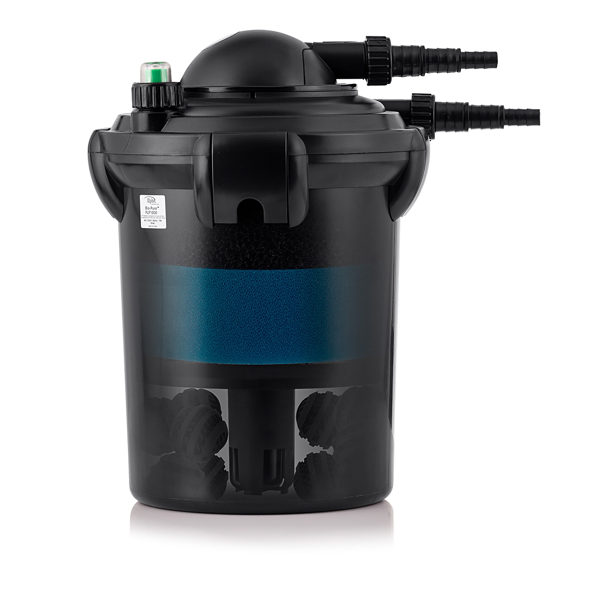 Keep your garden’s pond clean and safe with the 15" tall Bio Pure Pressure Filter from Alpine Corporation. This outdoor pond filter uses a multi stage biological and mechanical filtration process that uses a unique filtering process to provide maximum filtration and clear and quality water for a healthy pond. The durable foam pond filter features a large surface to provide long lasting quality use and increased filtration in ponds up to 1,000 gallons. It naturally cleans pond pollutants and sifts out debris, while allowing good, beneficial bacteria to thrive in its natural environment. For added convenience, the foam filter utilizes a unique external pressure indicator. This cleaning indicator helps to notify you when the filtration system is properly functioning and when cleaning the filter is necessary. The filtration system requires no assembly and is easy to install. The discrete filter system measures 11"L x 11"W x 15"H and is meant to be partially buried, and it includes a one year manufacturer's Support from purchase date.