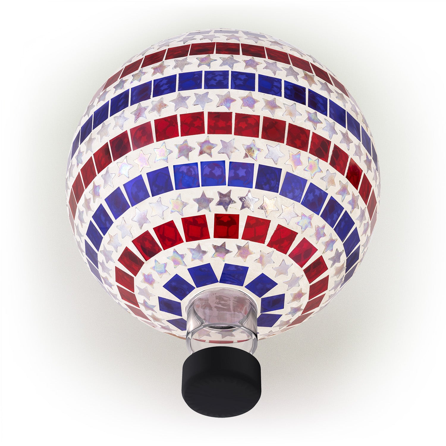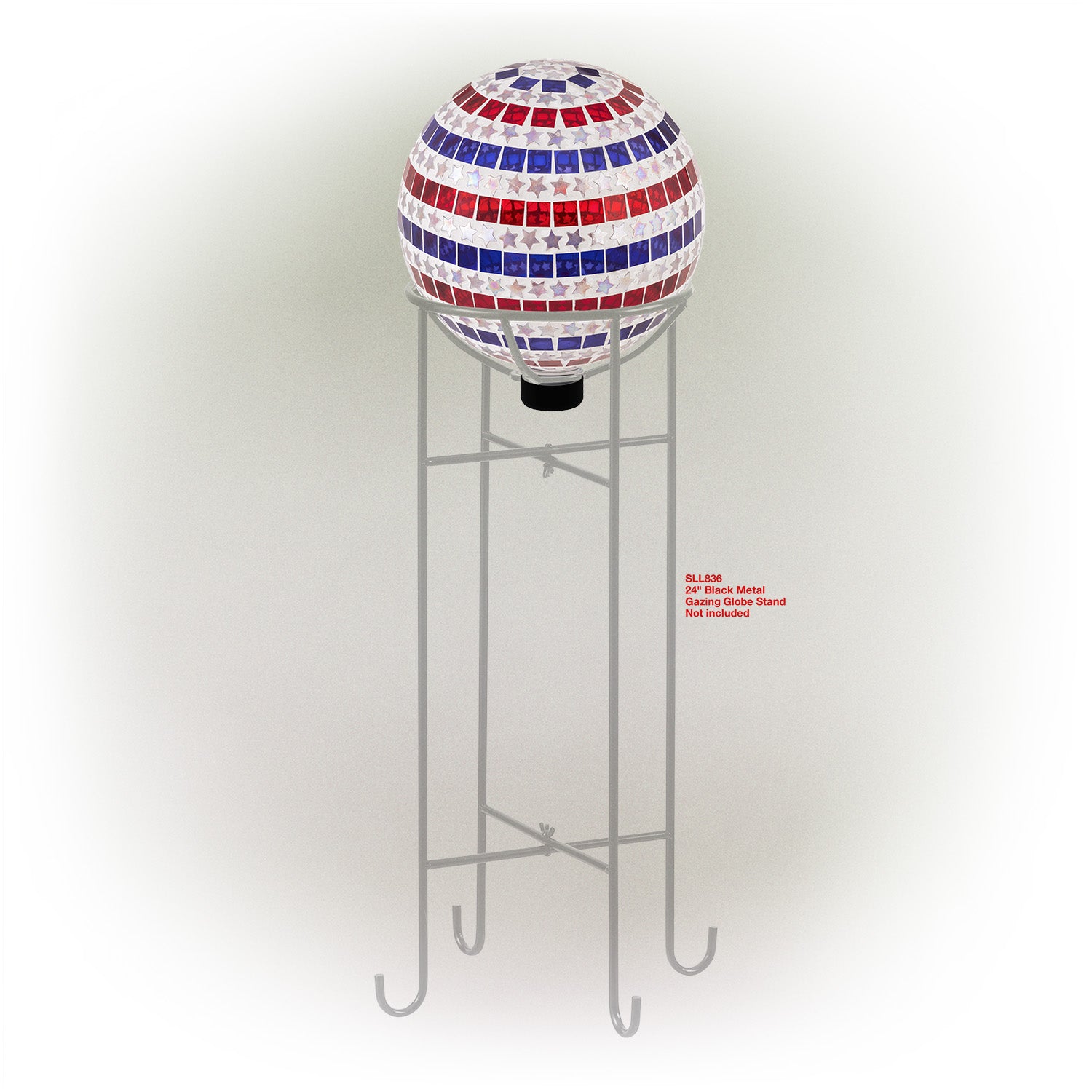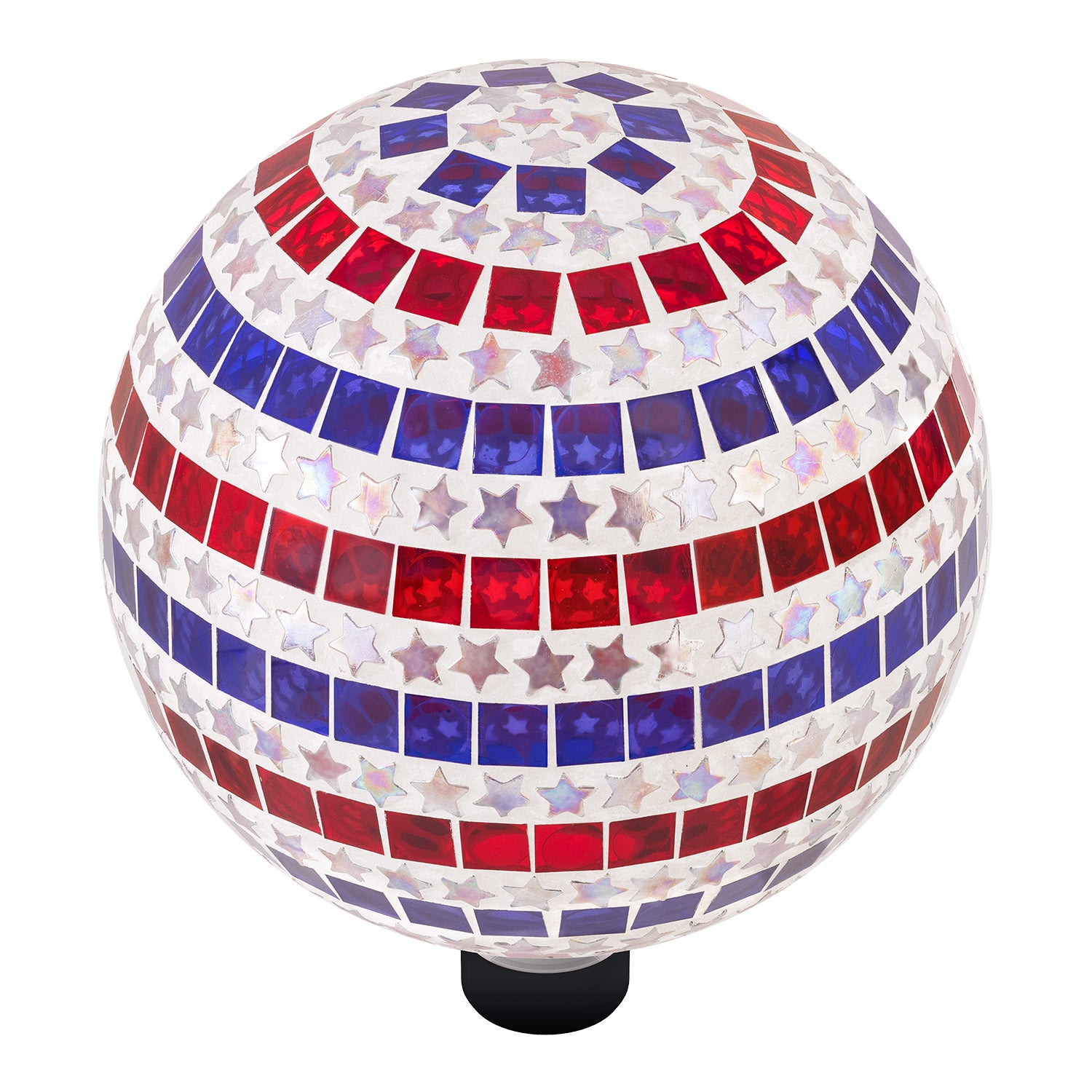Add beautiful, bright color to your yard with Alpine’s 10" Diameter Indoor/Outdoor Patriotic Glass Stars and Stripes Gazing Globe Yard Decoration. Made from red, white and blue colored pieces of glass, this spherical yard art décor provides a unique and patriotic addition to your home's interior or exterior décor with its colorful, flag inspired mosaic pattern design. The multi use glass gazing ball can be used in a variety of ways, including in your garden, patio, courtyard, or front door entryway or as an accent piece in your living room. Add one or multiple glass orbs to enhance your formal or informal garden's natural beauty with their electrifying colors and iridescent shine. The glass globes create a gorgeous pattern on a flat, even surface like decks, patios, walkways, and sidewalks. Use a metal stand (sold separately) in varying heights to help create visual interest and depth to your soon to be award winning lawn. This colored glass gazing ball will add vibrant color and shine to your garden while showing off your American pride. This colorful glass gazing sphere measures 10"L x 10"W x 12"H to fit almost any outdoor area and includes a one year manufacturer's Support from date of purchase.